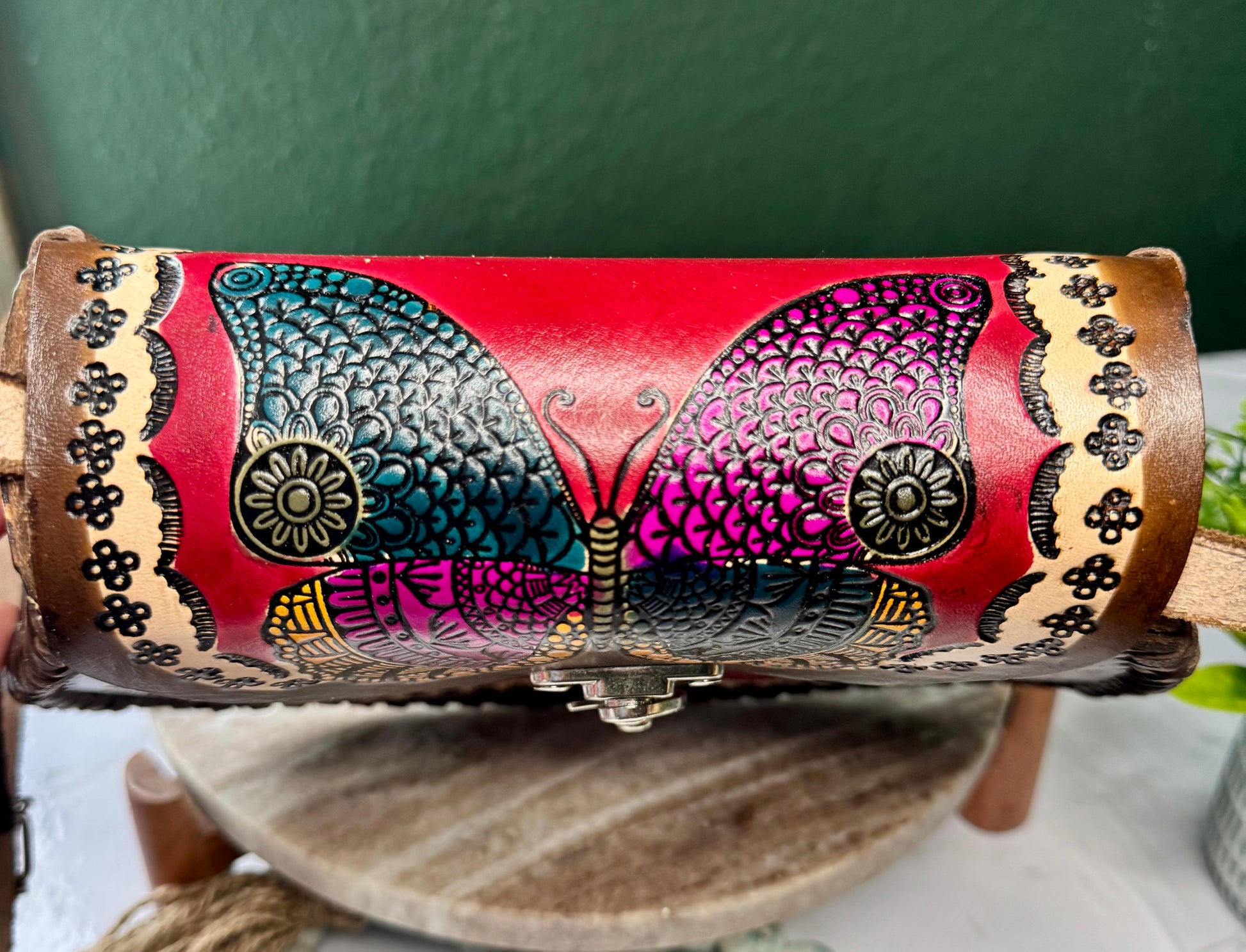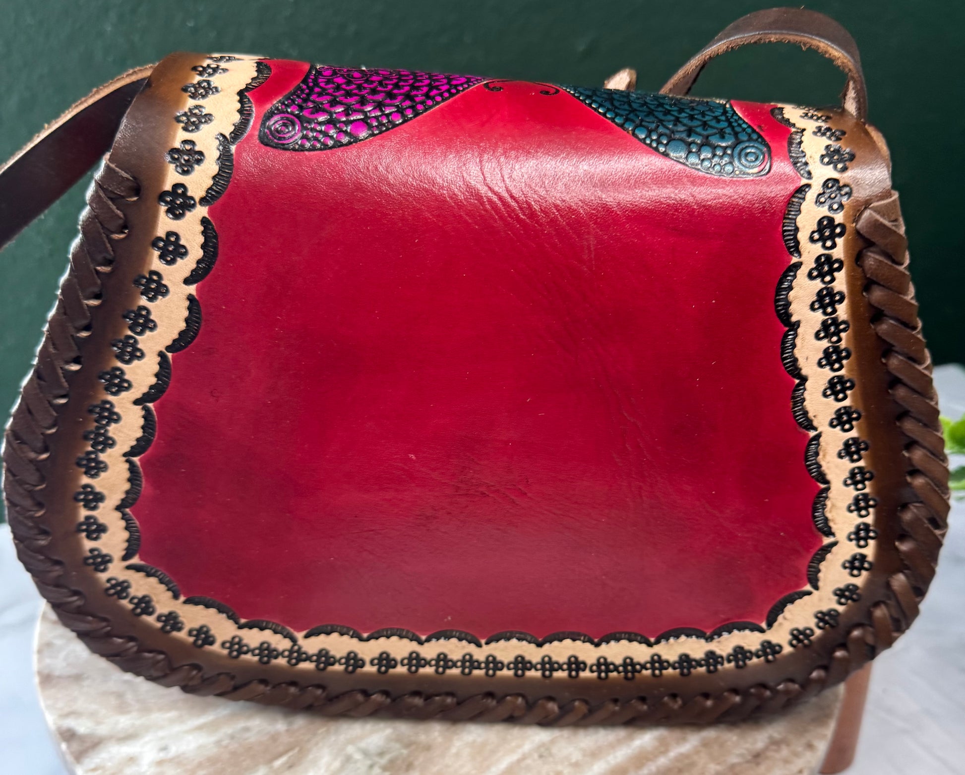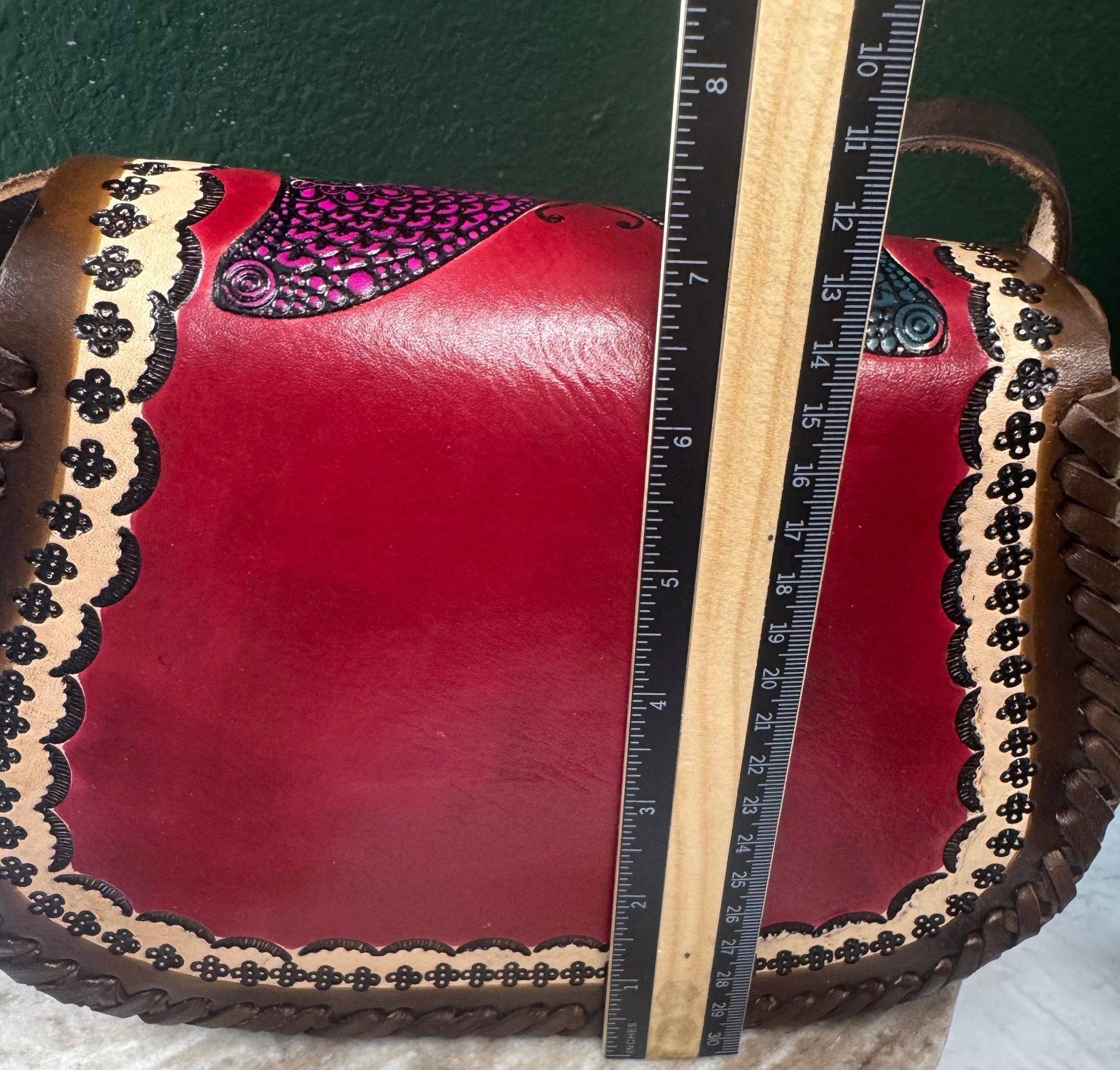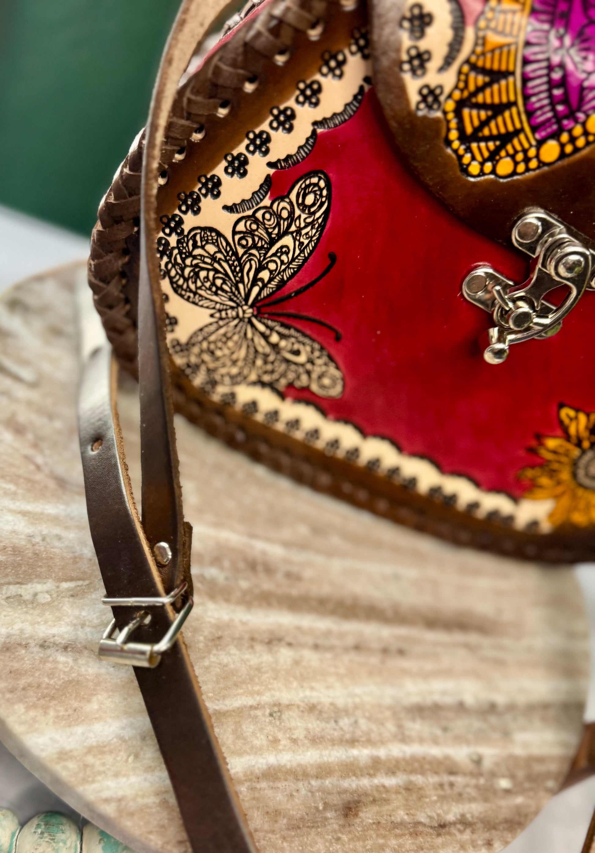 This purse is hand-tooled (cincelada) and hand-painted, which means small imperfections, variations, or minor marks may be present. These are not flaws, but a natural part of the handmade process and add to the uniqueness and character of each piece. No two bags are exactly alike each one is truly one of a kind.