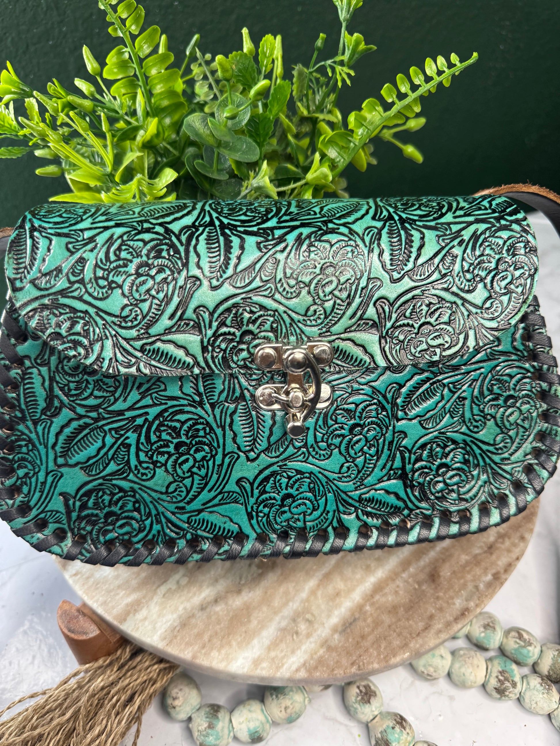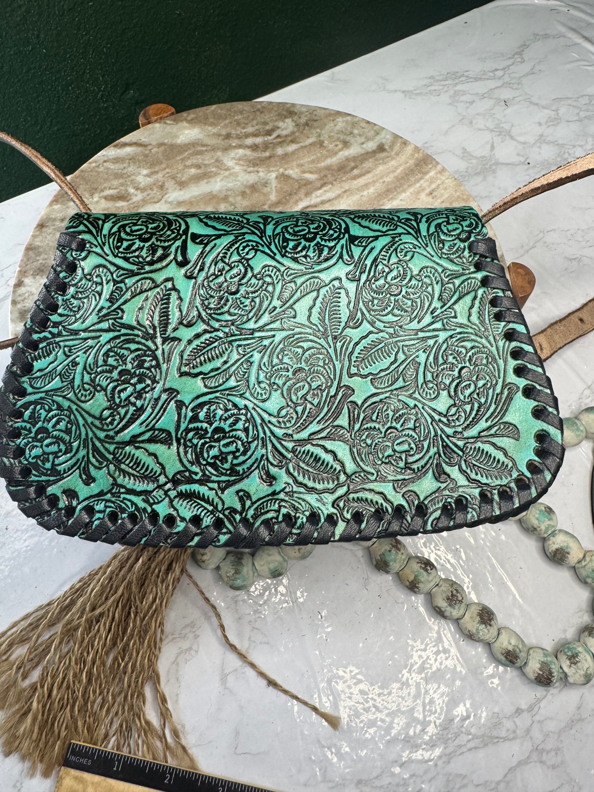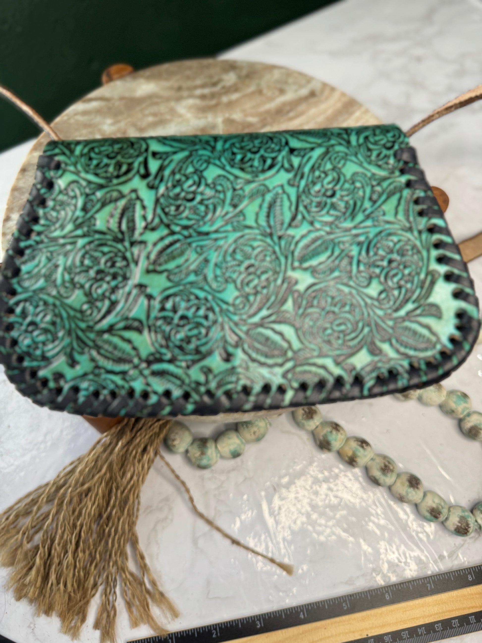 This beautiful genuine leather crossbody purse features hand-tooled (cincelada) and hand-painted artwork with colorful details. The leather is carefully tooled to create raised, textured designs, then painted by hand, making each purse truly one of a kind.Finished with hand-laced edges and a secure clasp closure, this purse blends boho, western, and artisan style. Perfect for everyday use or as a unique gift for someone who loves handcrafted leather goods.Hand made by artesanos from Mexico💖