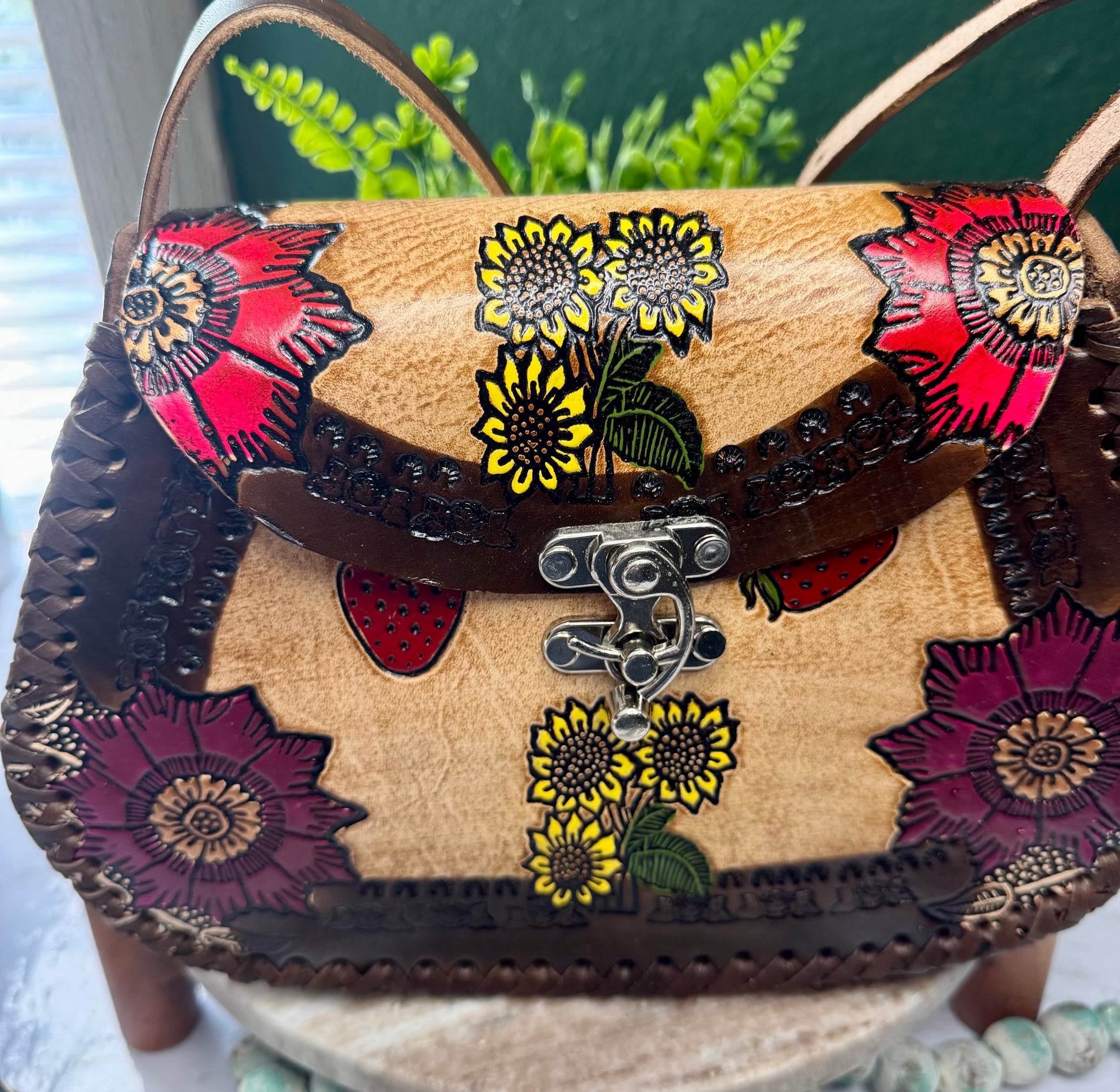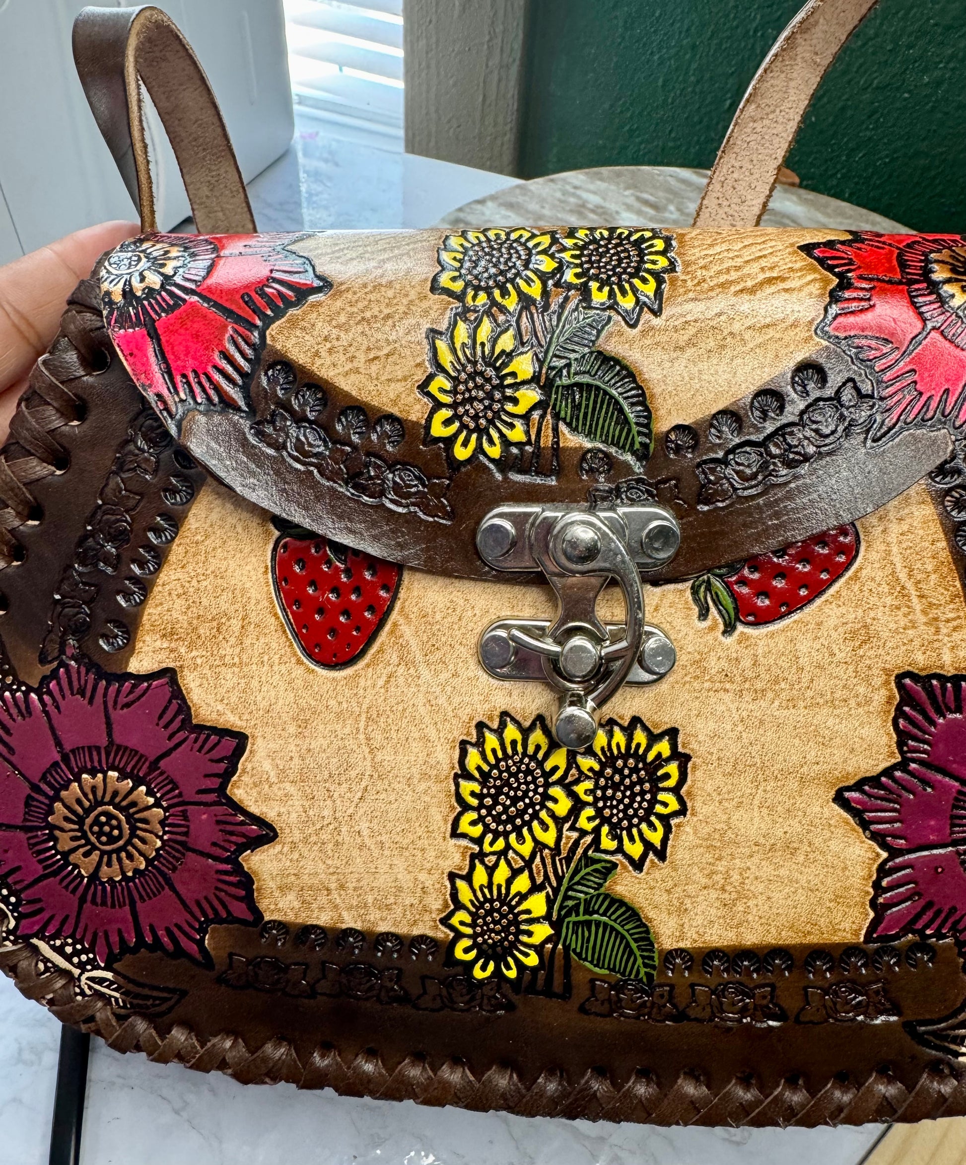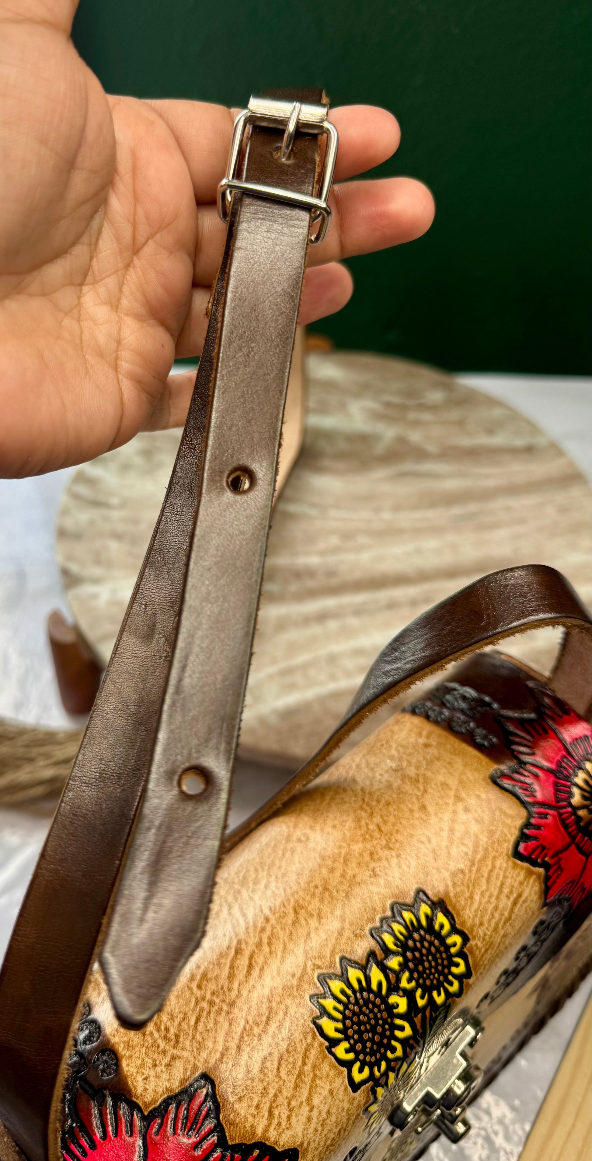 This purse is hand-tooled (cincelada) and hand-painted, which means small imperfections, variations, or minor marks may be present. These are not flaws, but a natural part of the handmade process and add to the uniqueness and character of each piece. No two bags are exactly alike each one is truly one of a kind.