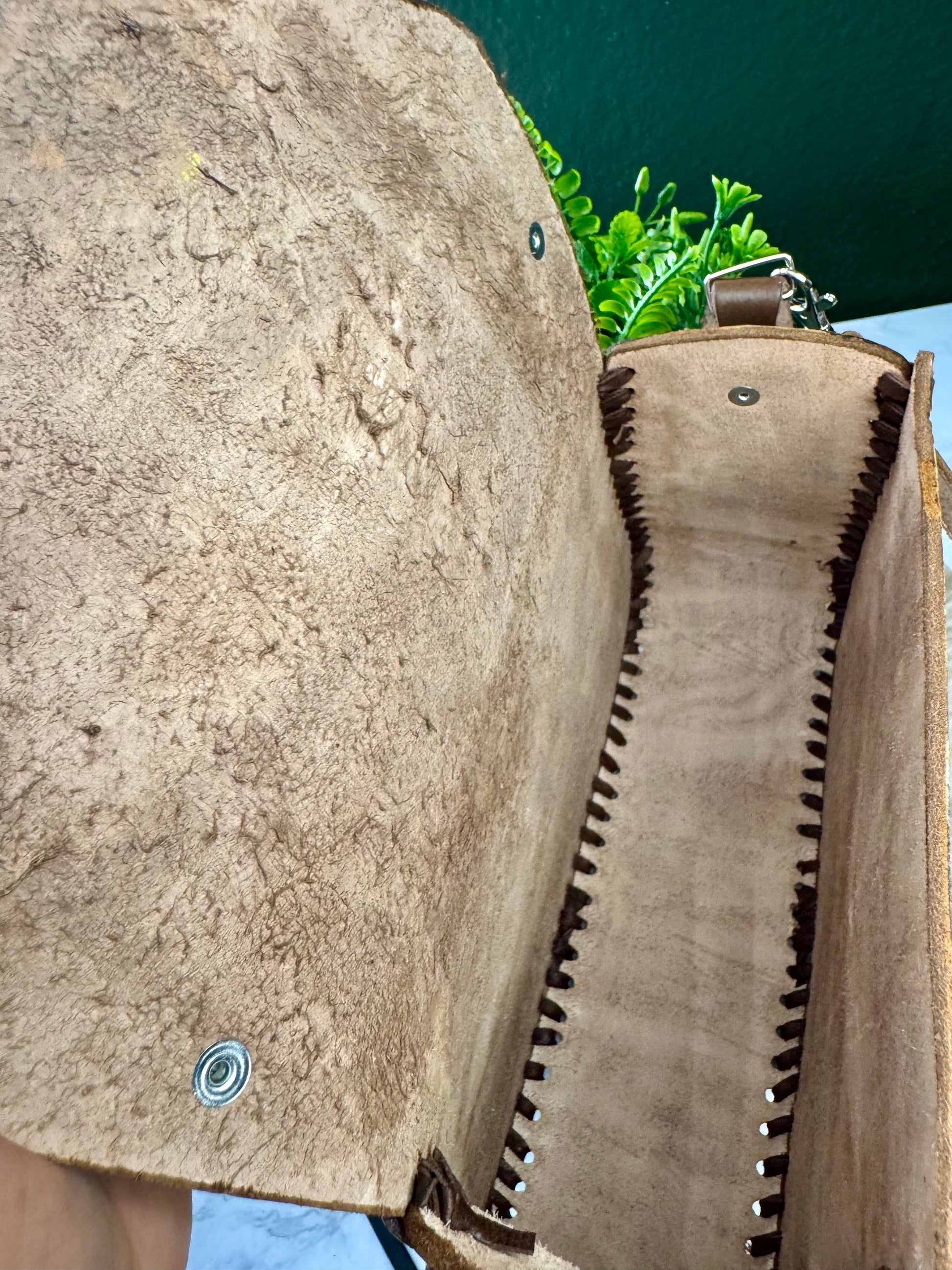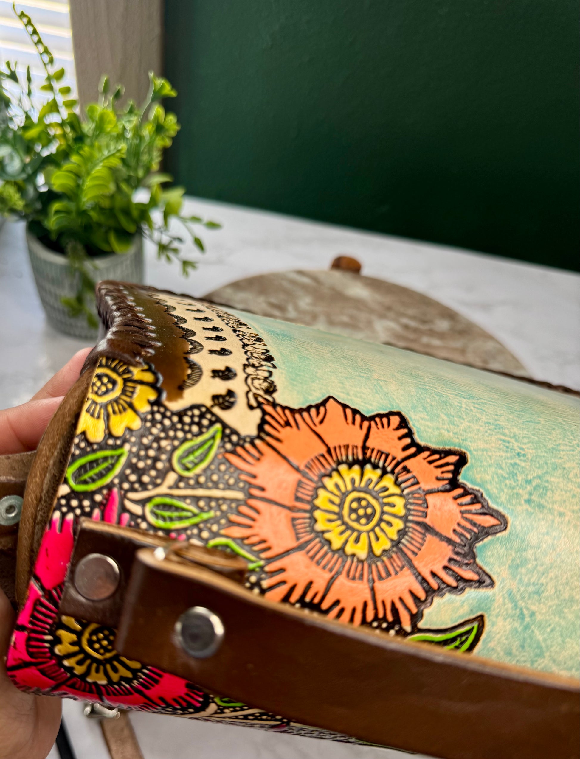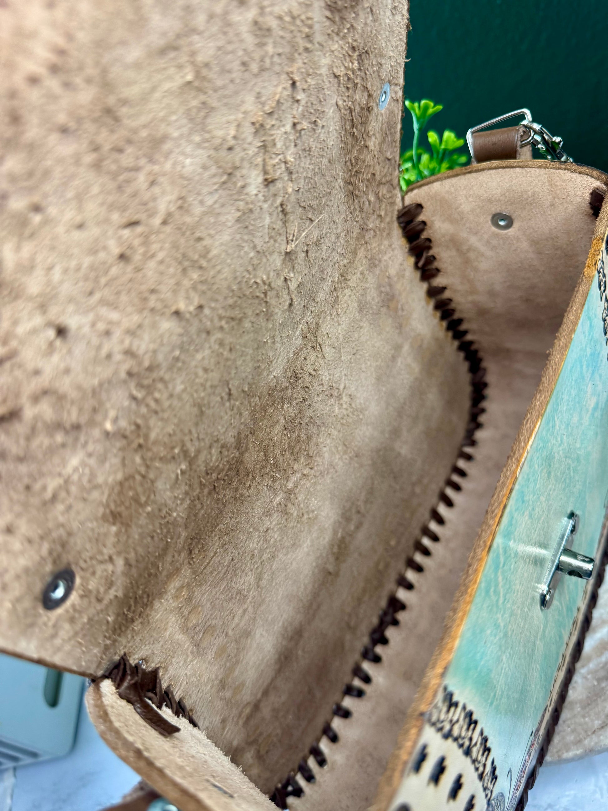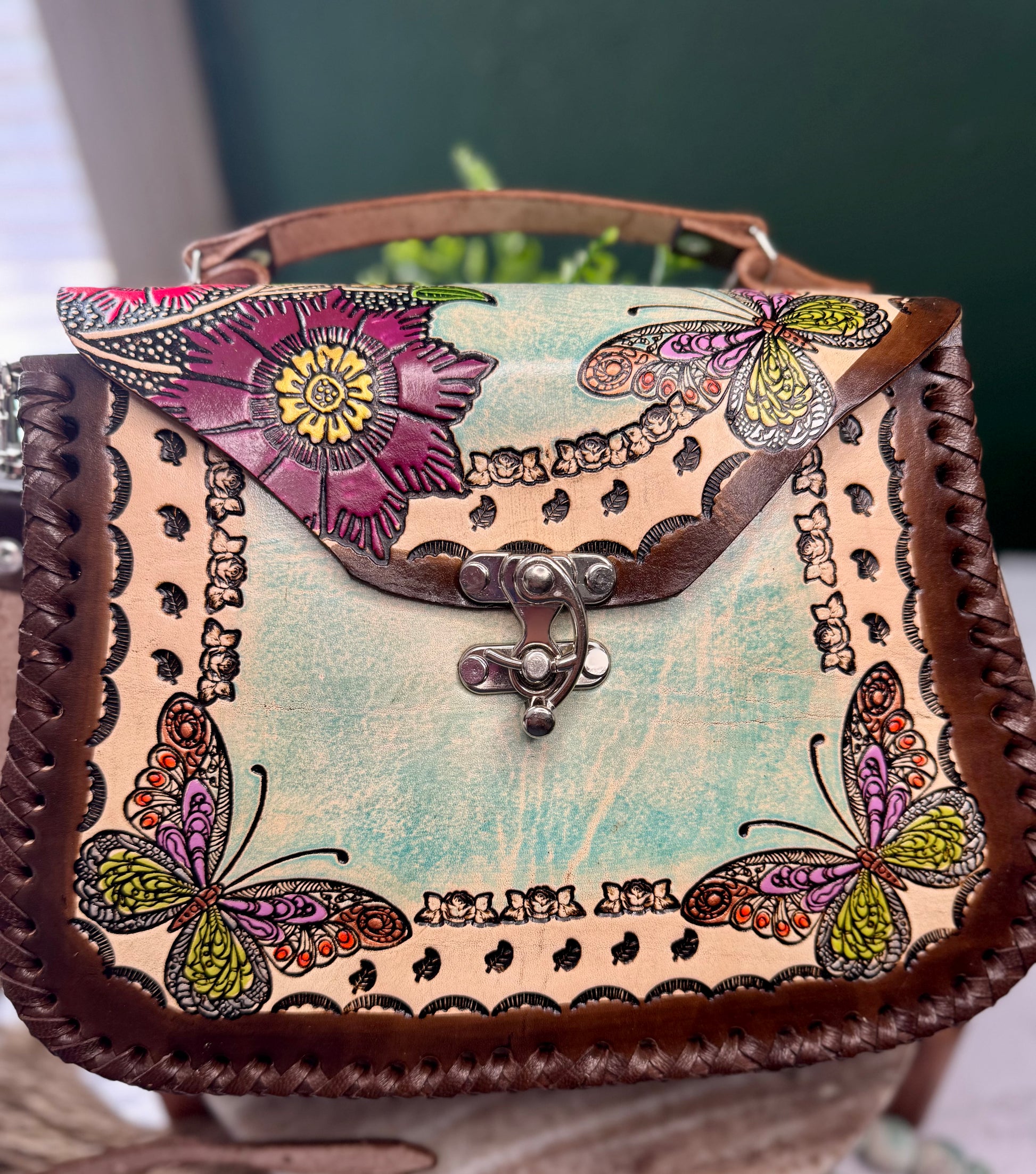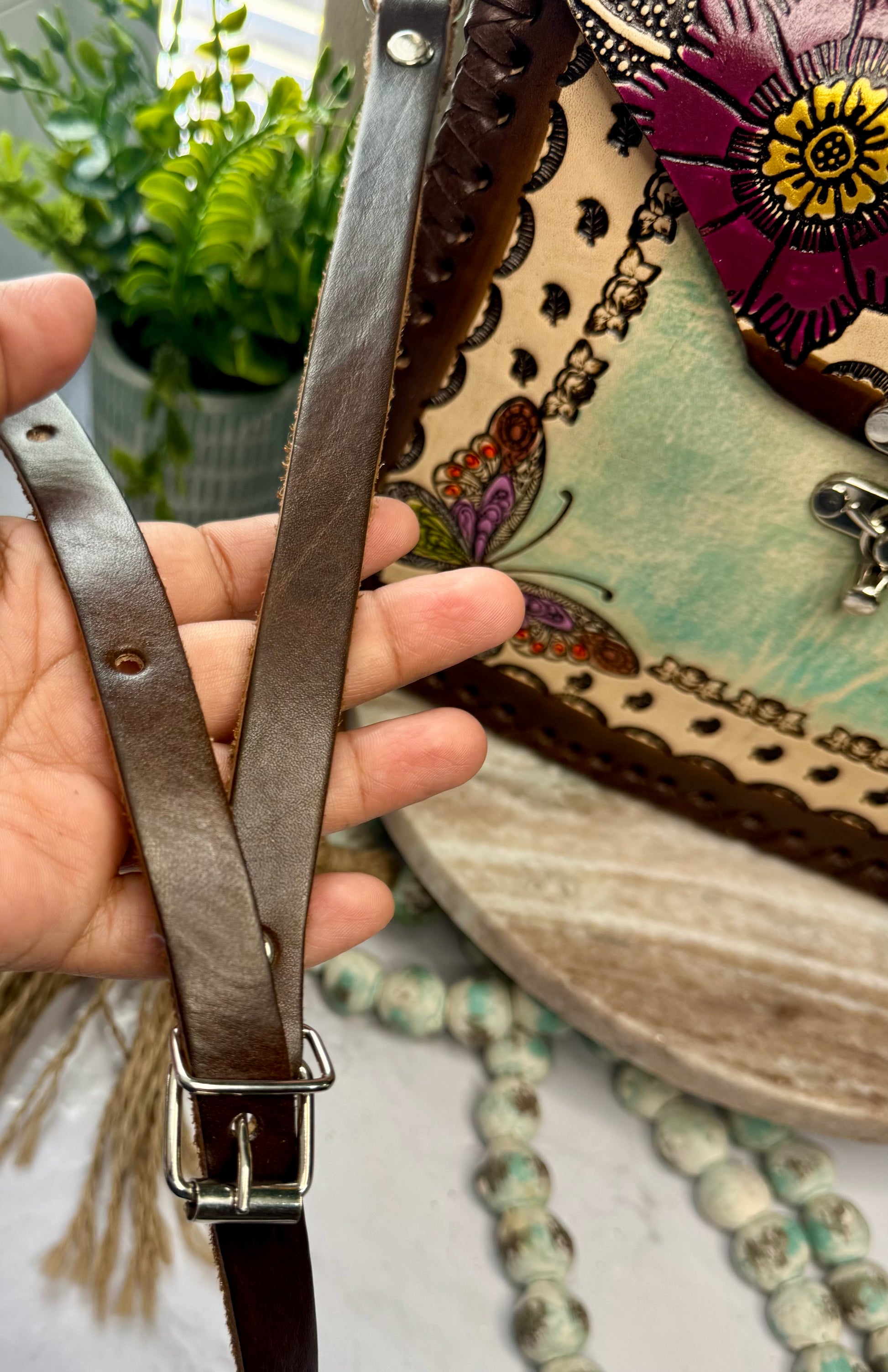 This purse is hand-tooled (cincelada) and hand-painted, which means small imperfections, variations, or minor marks may be present. These are not flaws, but a natural part of the handmade process and add to the uniqueness and character of each piece. No two bags are exactly alike each one is truly one of a kind.