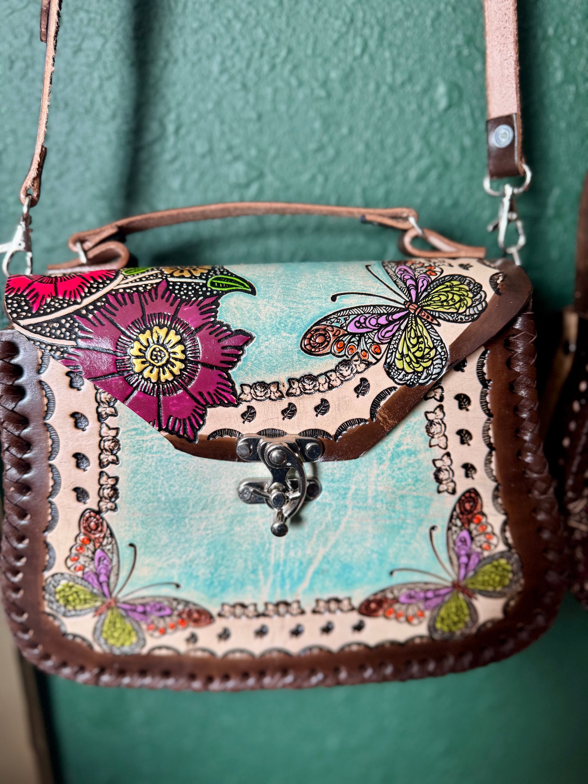 This beautiful genuine leather crossbody purse features hand-tooled (cincelada) and hand-painted artwork with colorful details. The leather is carefully tooled to create raised, textured designs, then painted by hand, making each purse truly one of a kind.Finished with hand-laced edges and a secure clasp closure, this purse blends boho, western, and artisan style. Perfect for everyday use or as a unique gift for someone who loves handcrafted leather goods.Hand made by artesanos from Mexico💖