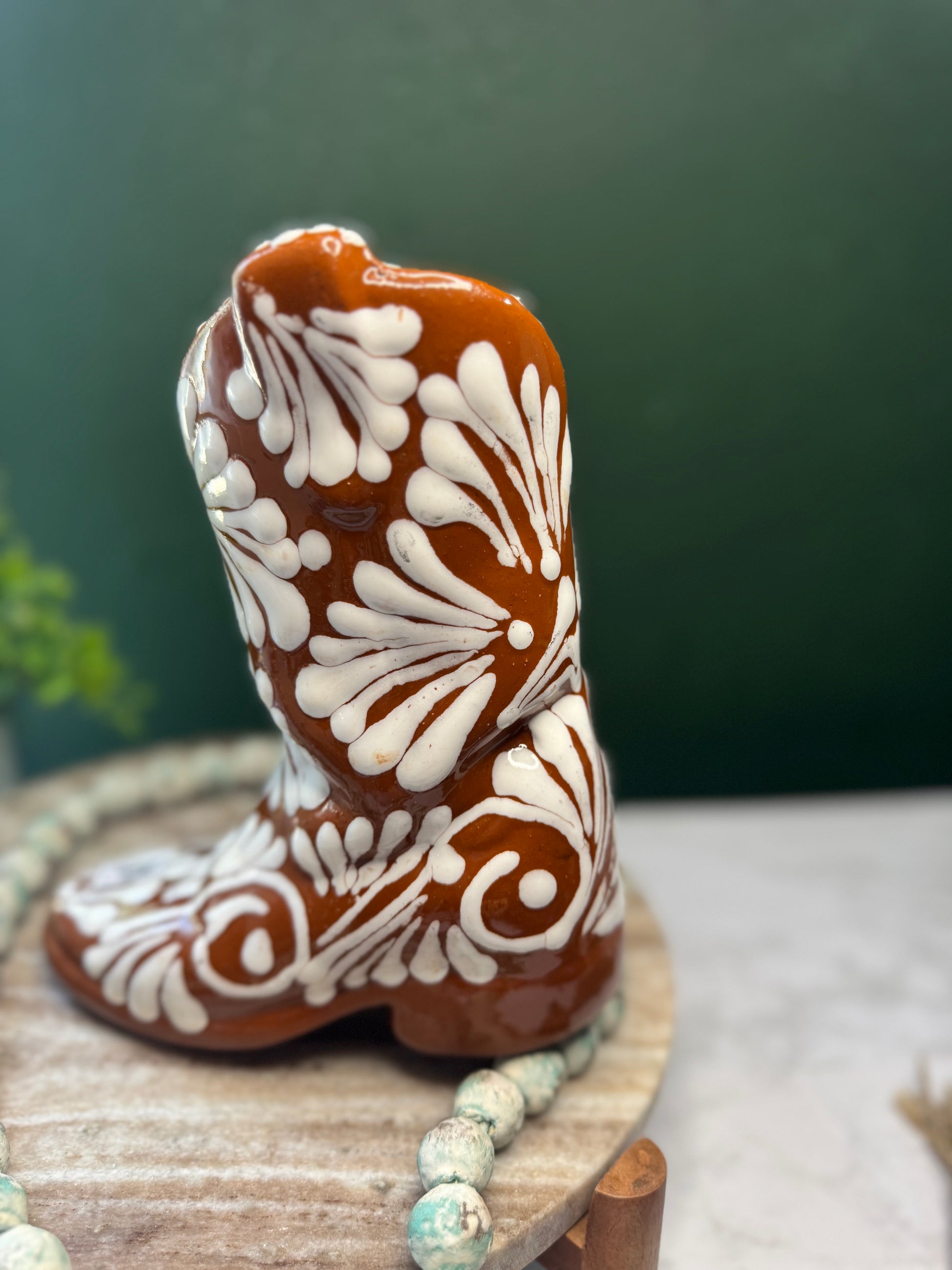 Talavera boot vase, handcrafted by Mexican artisans. Each piece is unique and may feature slight variations or imperfections that reflect its handmade nature.