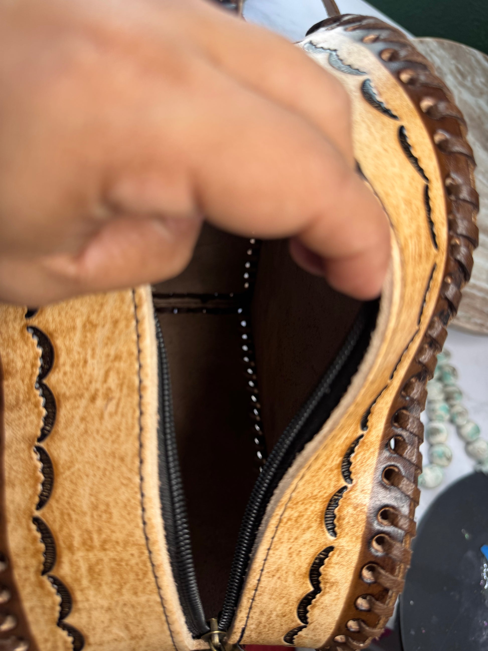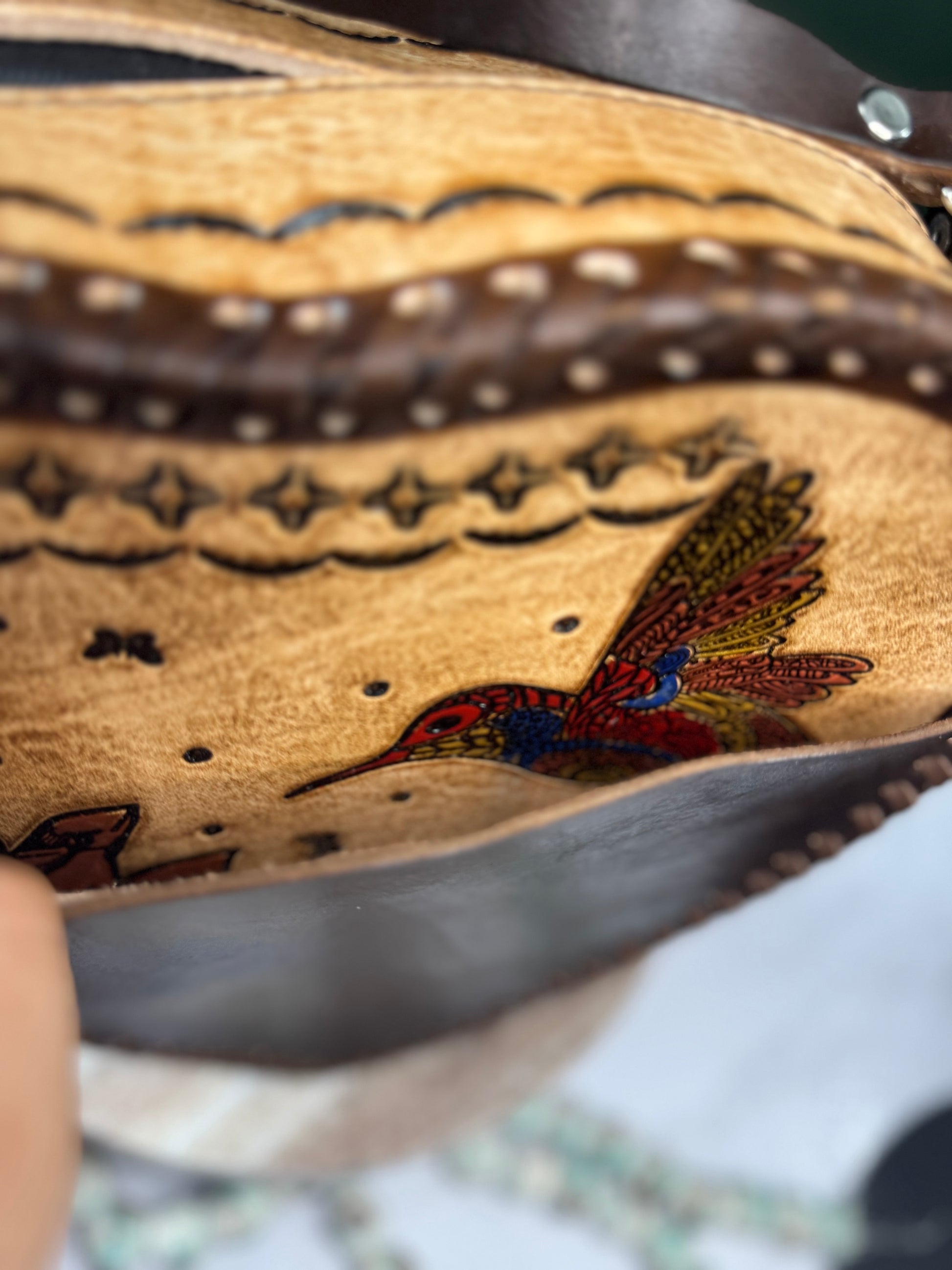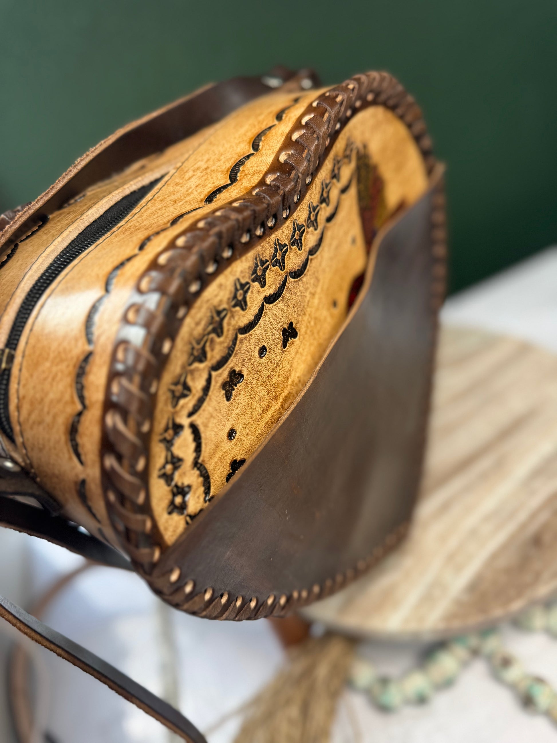 This purse is hand-tooled (cincelada) and hand-painted, which means small imperfections, variations, or minor marks may be present. These are not flaws, but a natural part of the handmade process and add to the uniqueness and character of each piece. No two bags are exactly alike each one is truly one of a kind.