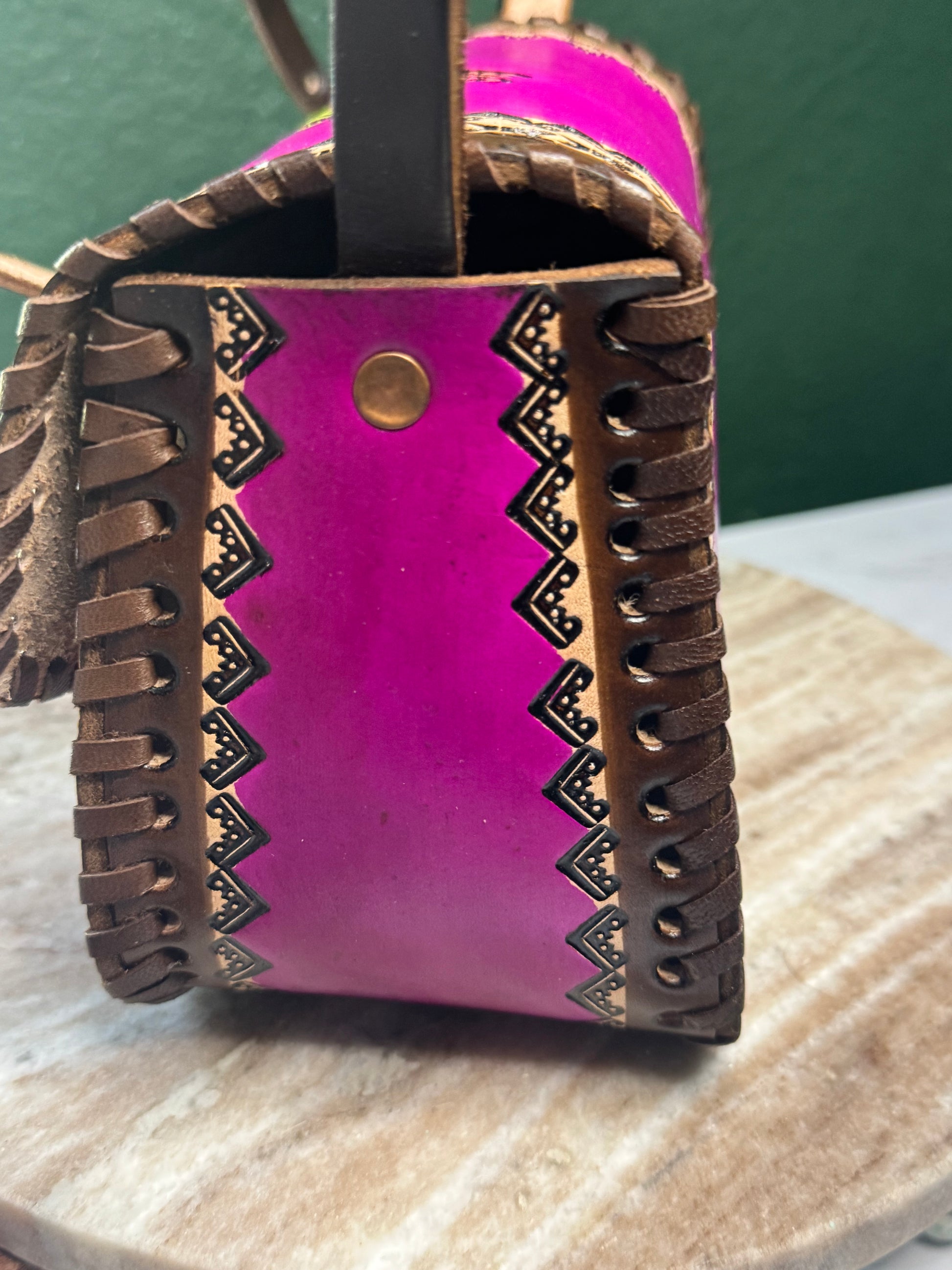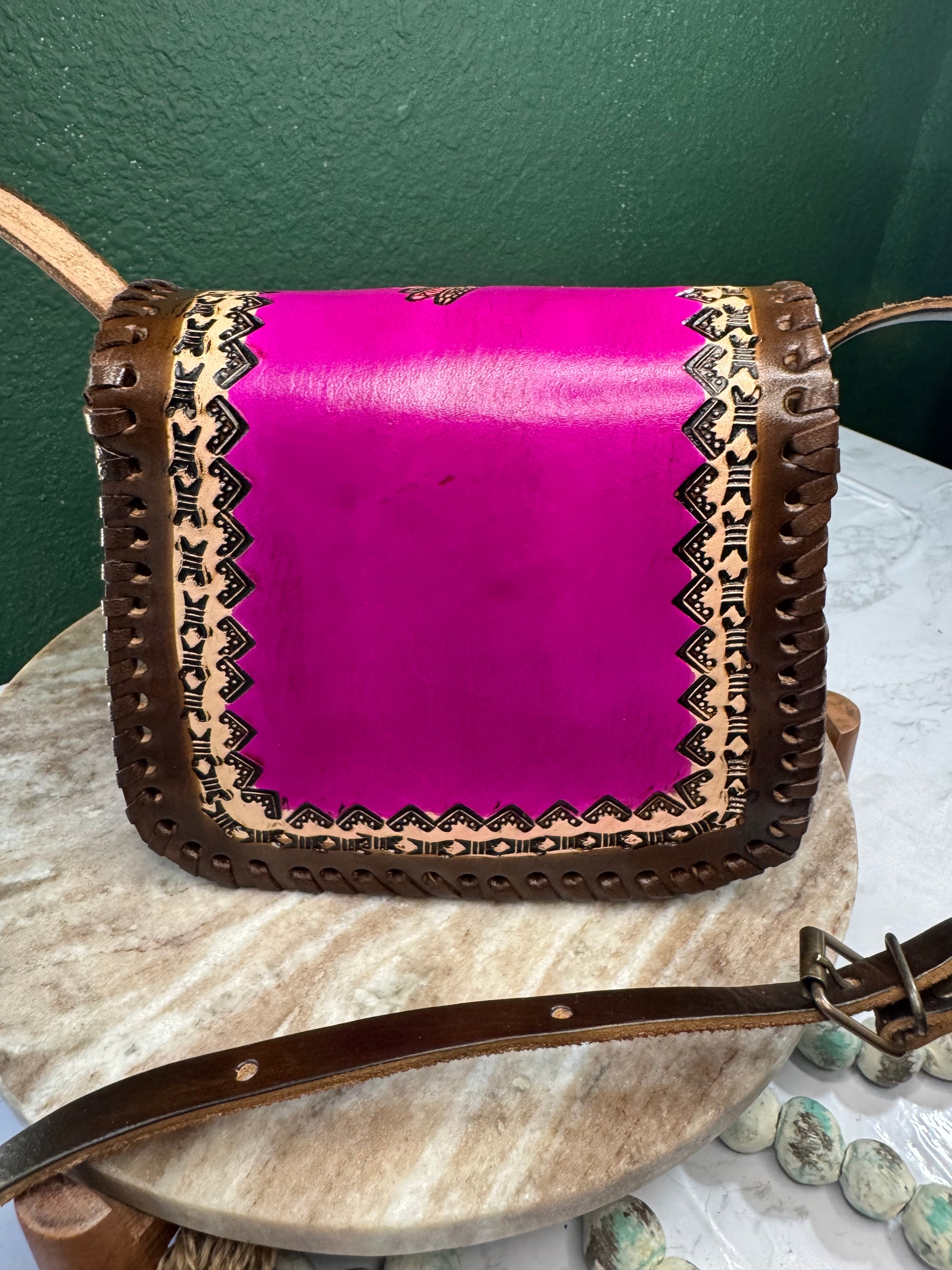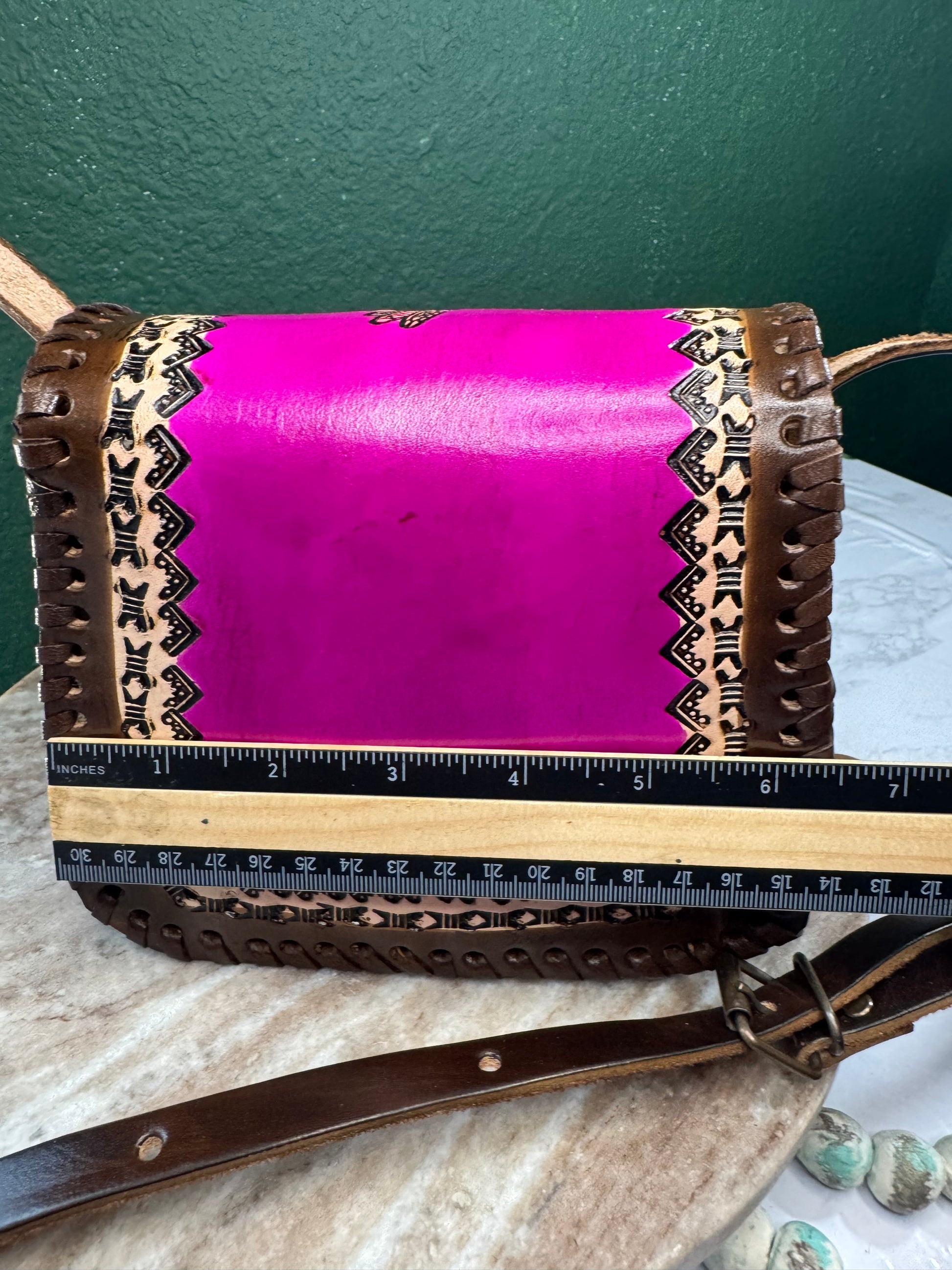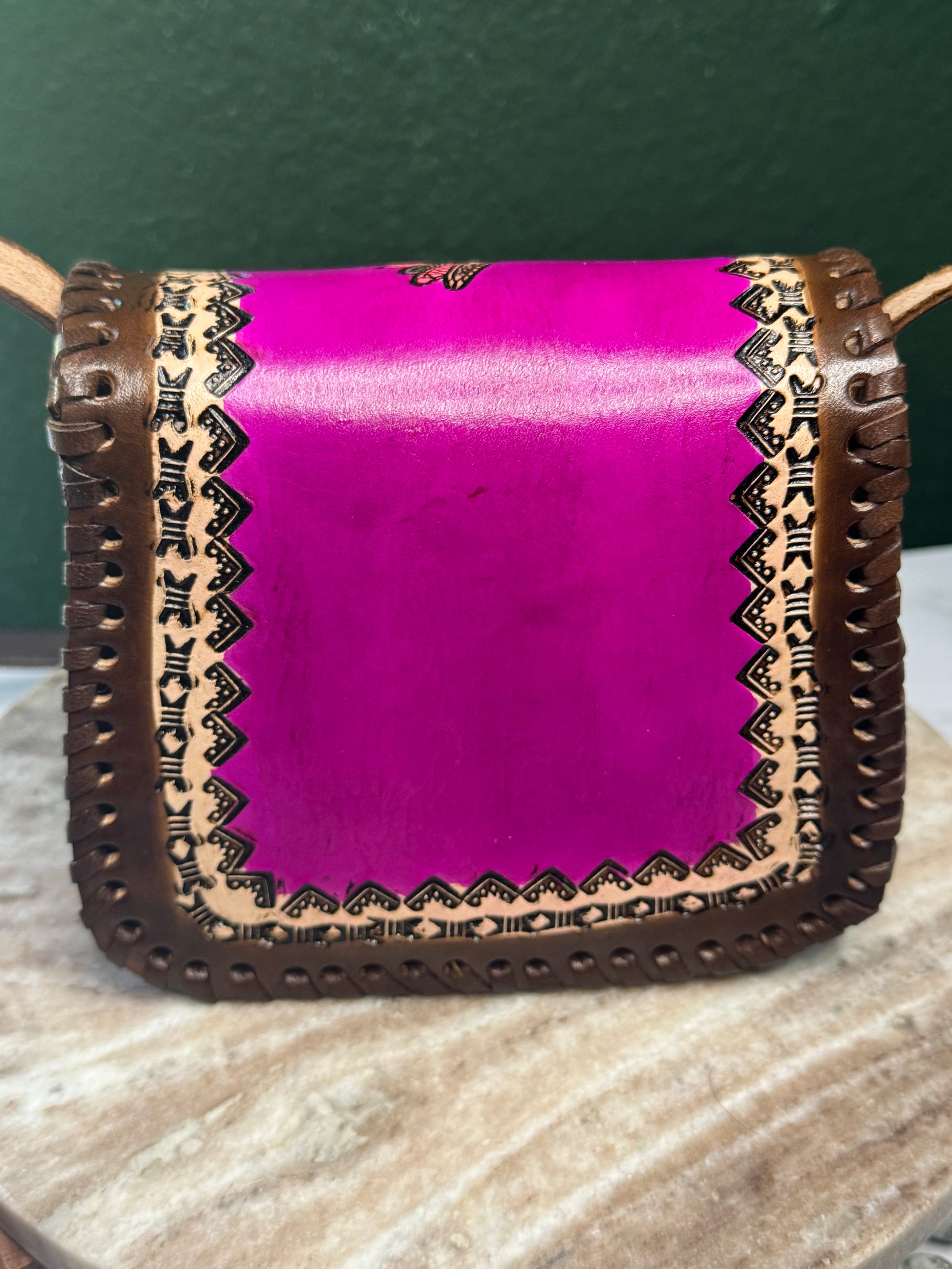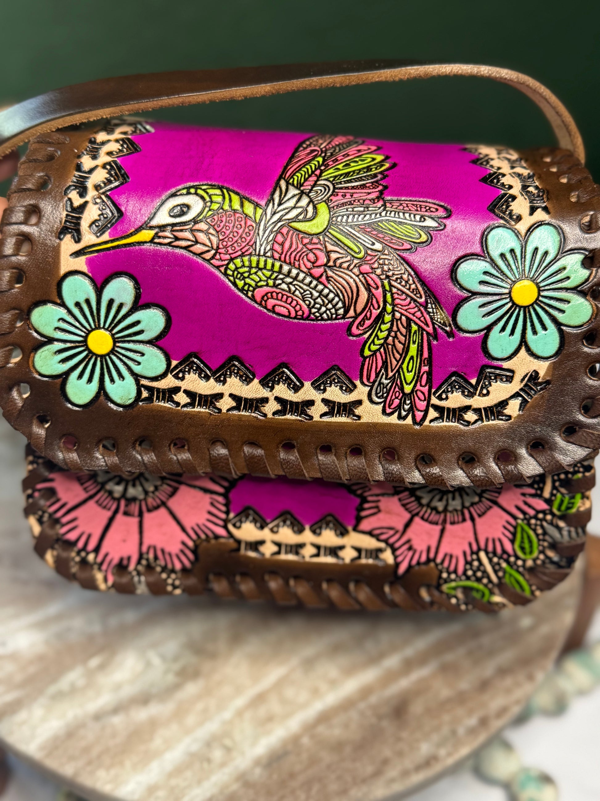 This beautiful genuine leather crossbody purse features hand-tooled (cincelada) and hand-painted artwork with colorful details. The leather is carefully tooled to create raised, textured designs, then painted by hand, making each purse truly one of a kind.Finished with hand-laced edges and a secure clasp closure, this purse blends boho, western, and artisan style. Perfect for everyday use or as a unique gift for someone who loves handcrafted leather goods.Hand made by artesanos from Mexico💖
