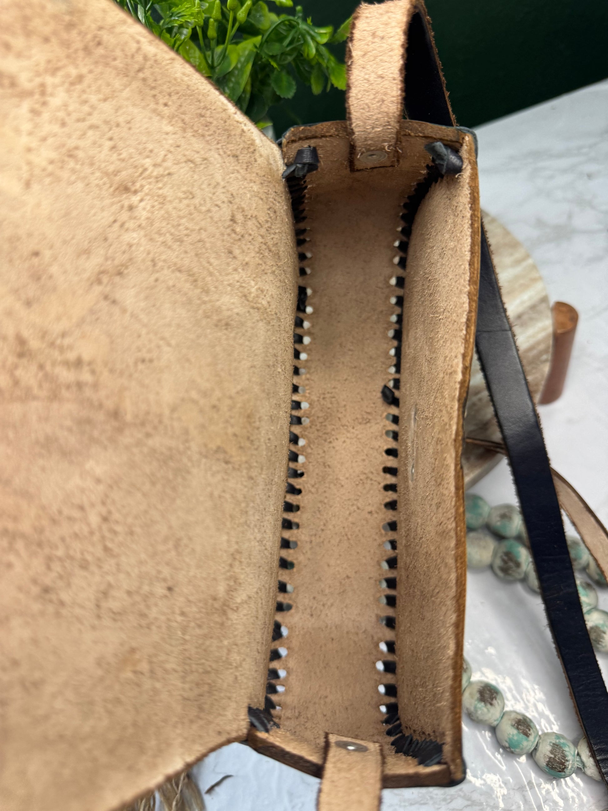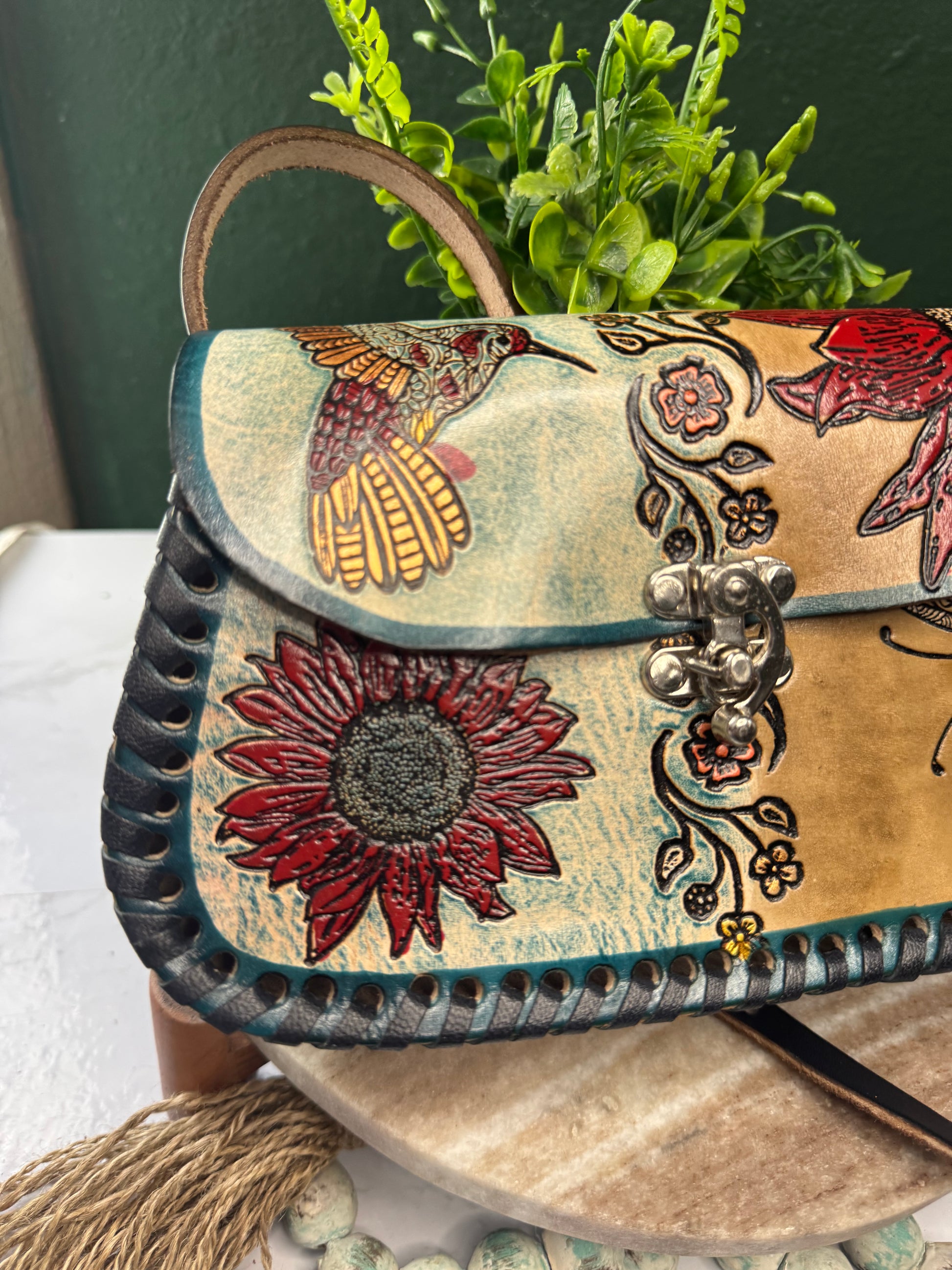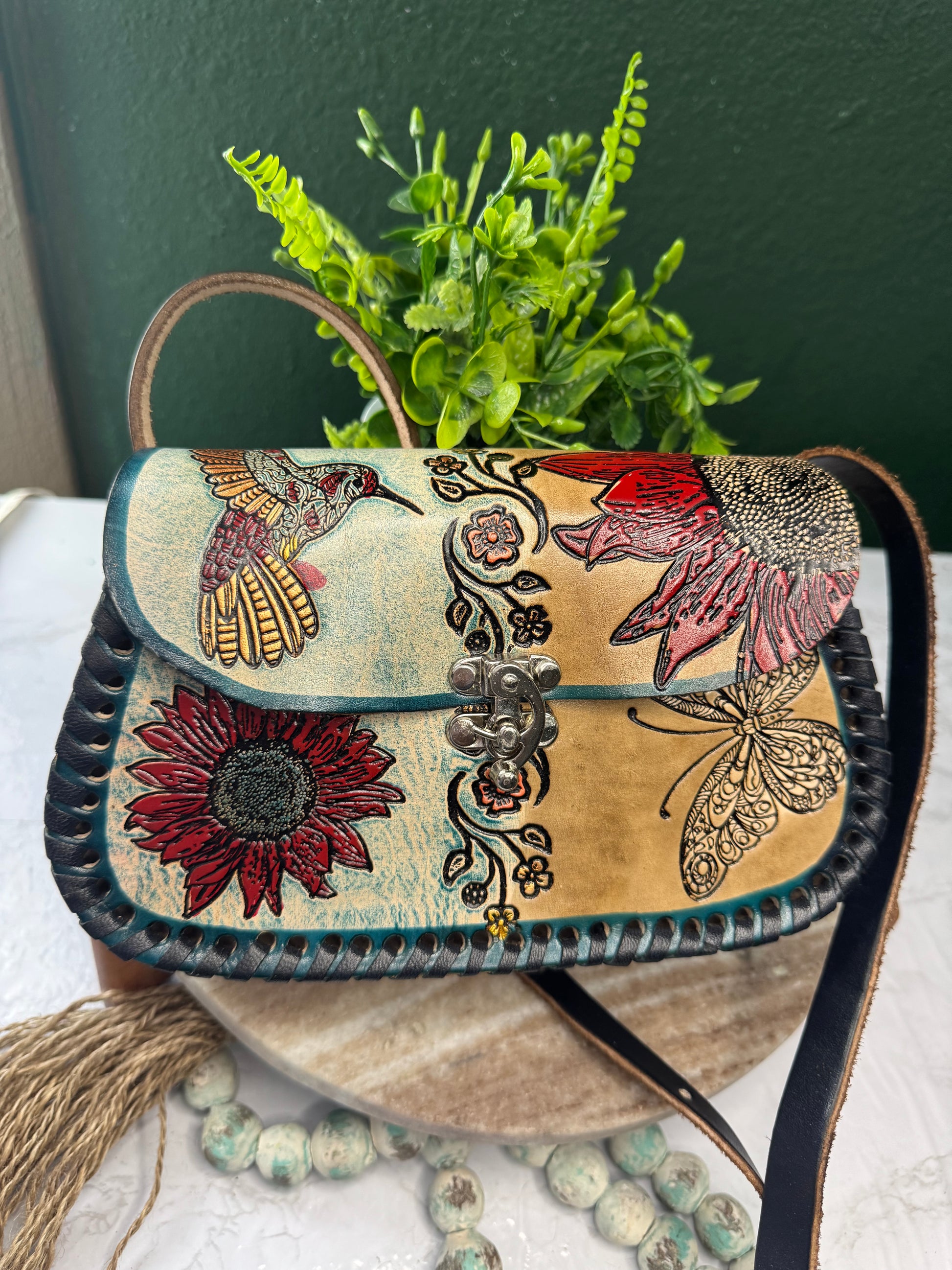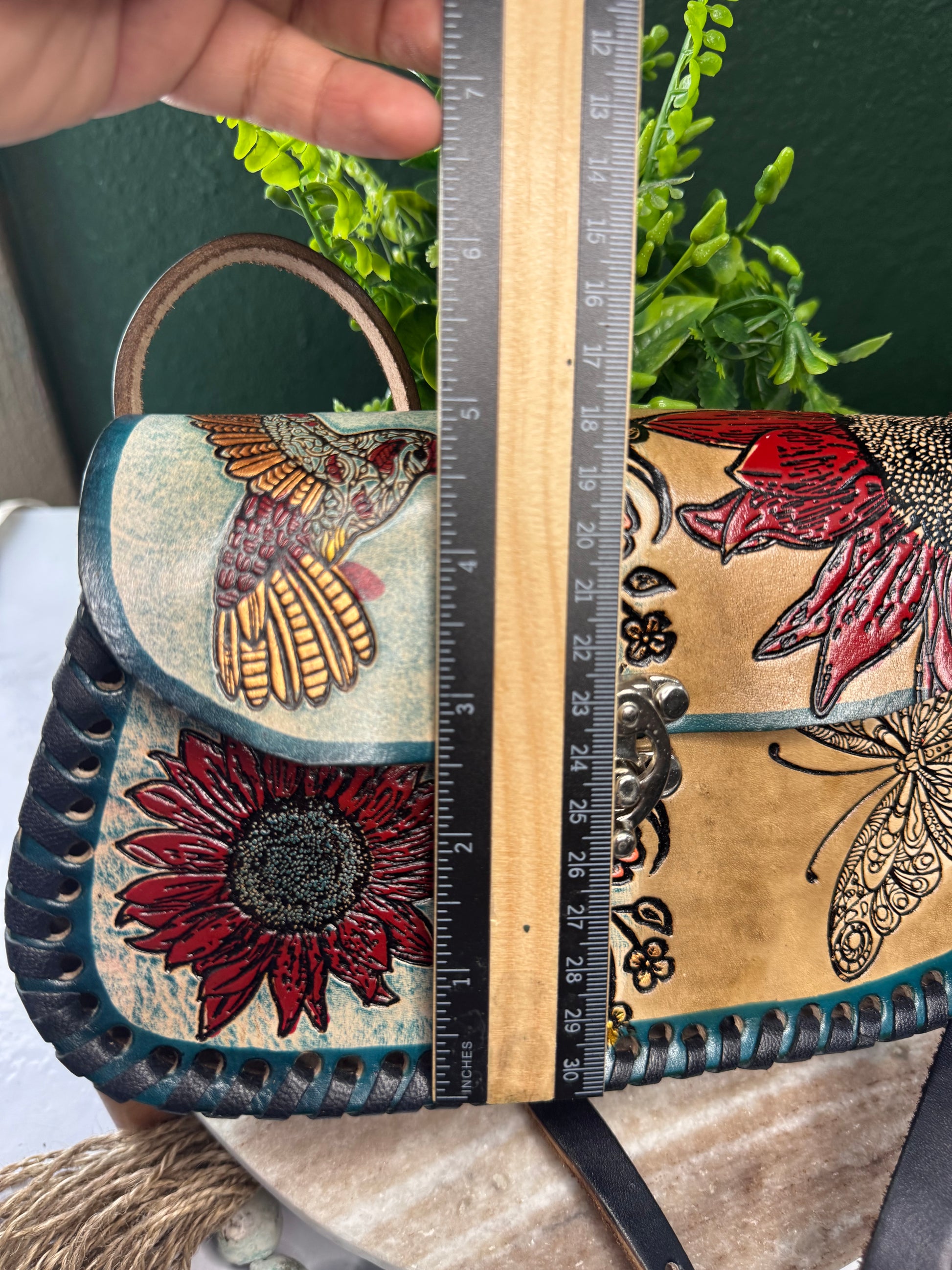 This beautiful genuine leather crossbody purse features hand-tooled (cincelada) and hand-painted artwork with colorful details. The leather is carefully tooled to create raised, textured designs, then painted by hand, making each purse truly one of a kind.Finished with hand-laced edges and a secure clasp closure, this purse blends boho, western, and artisan style. Perfect for everyday use or as a unique gift for someone who loves handcrafted leather goods.Hand made by artesanos from Mexico💖