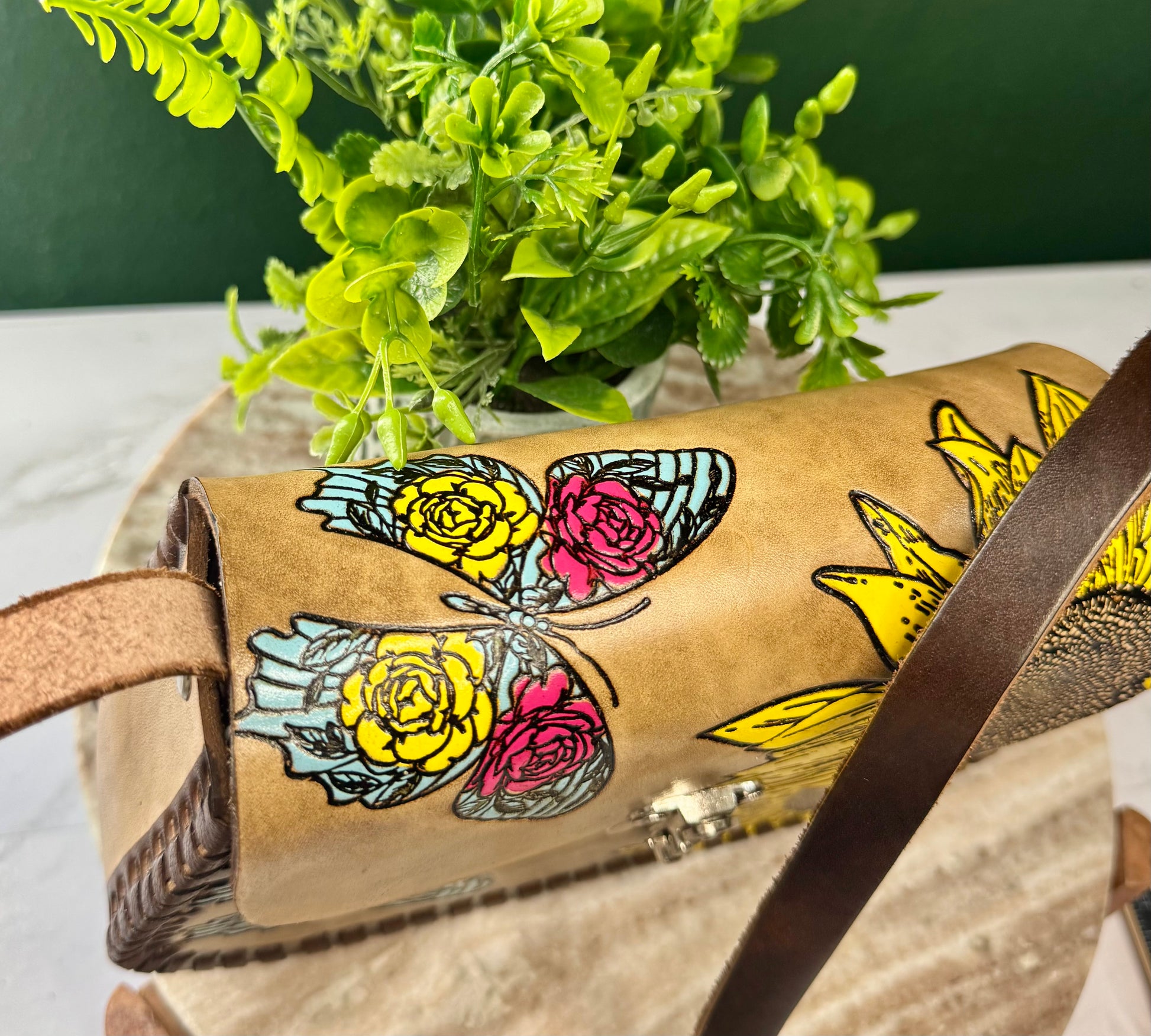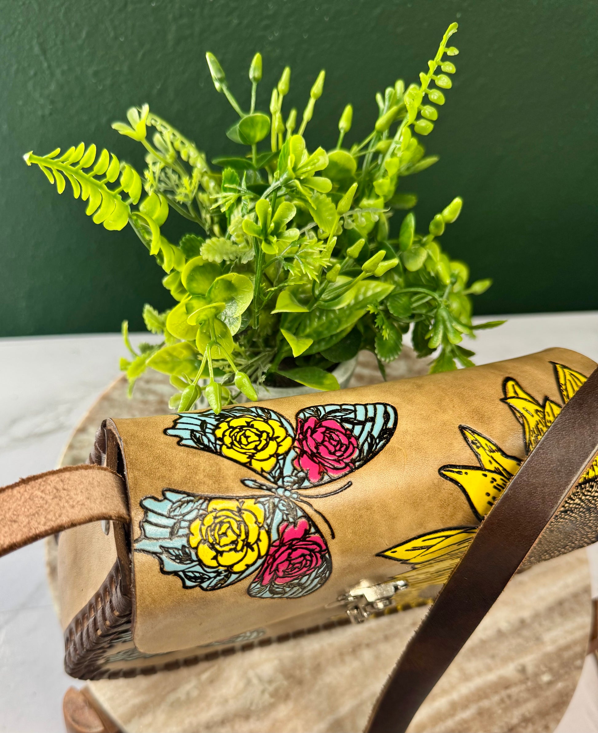 This purse is hand-tooled (cincelada) and hand-painted, which means small imperfections, variations, or minor marks may be present. These are not flaws, but a natural part of the handmade process and add to the uniqueness and character of each piece. No two bags are exactly alike each one is truly one of a kind.