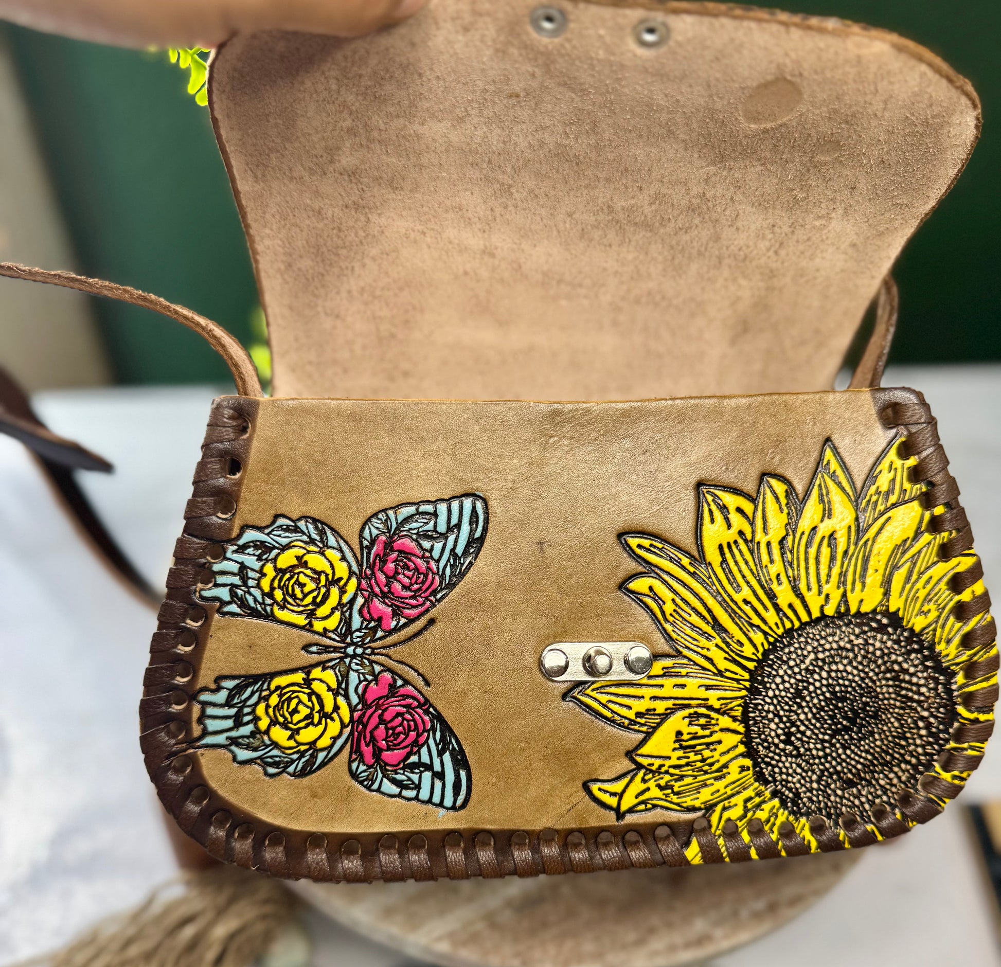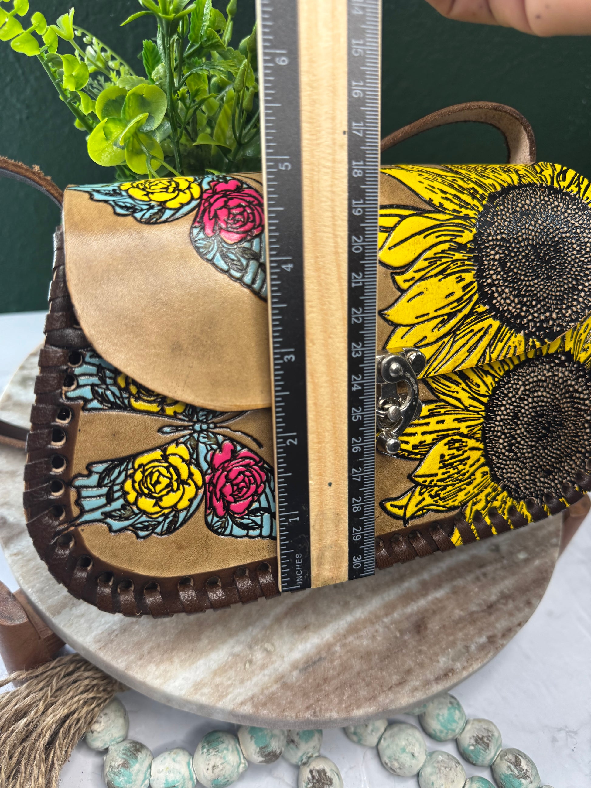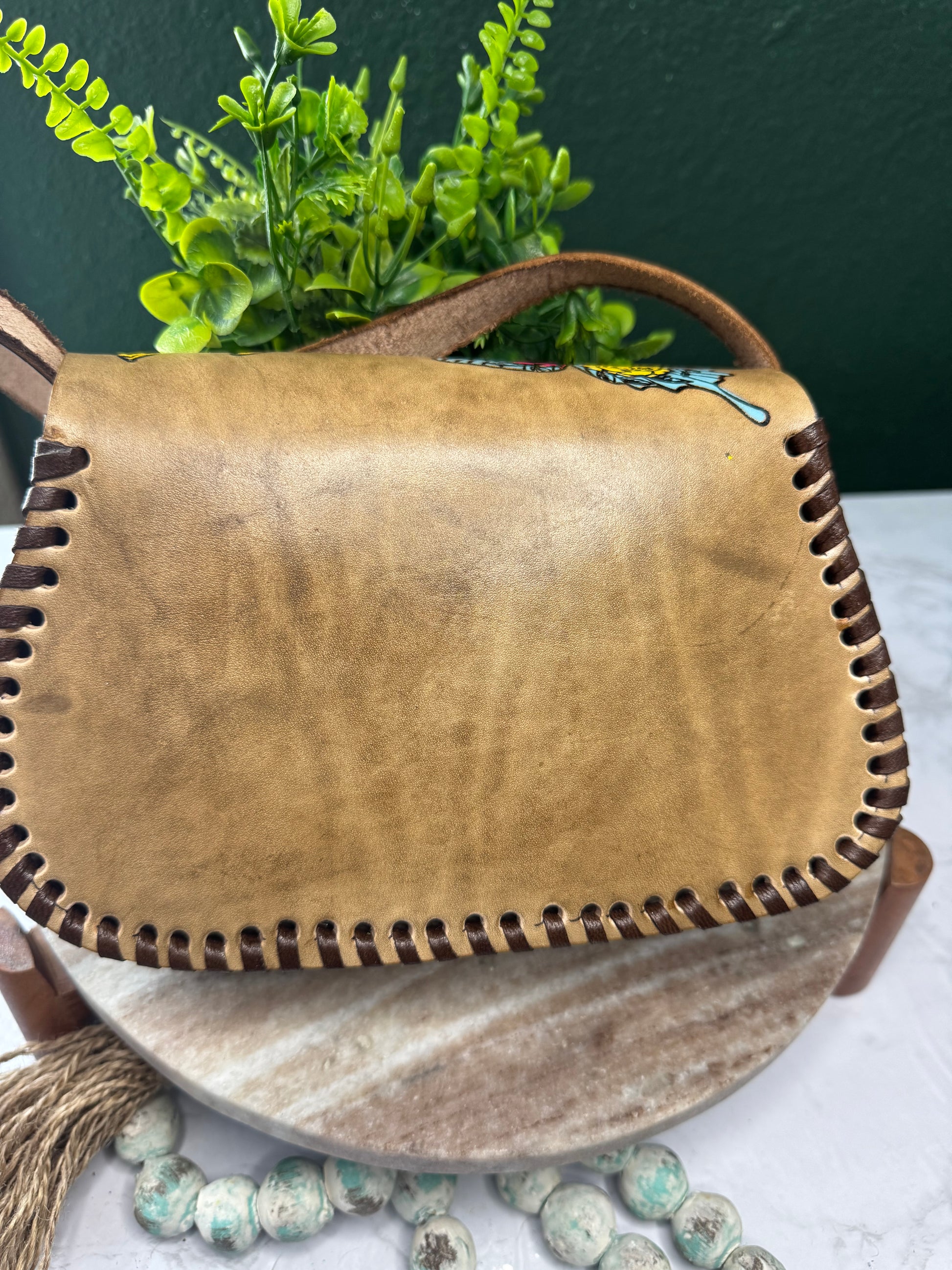 This beautiful genuine leather crossbody purse features hand-tooled (cincelada) and hand-painted artwork with colorful details. The leather is carefully tooled to create raised, textured designs, then painted by hand, making each purse truly one of a kind.Finished with hand-laced edges and a secure clasp closure, this purse blends boho, western, and artisan style. Perfect for everyday use or as a unique gift for someone who loves handcrafted leather goods.Hand made by artesanos from Mexico💖