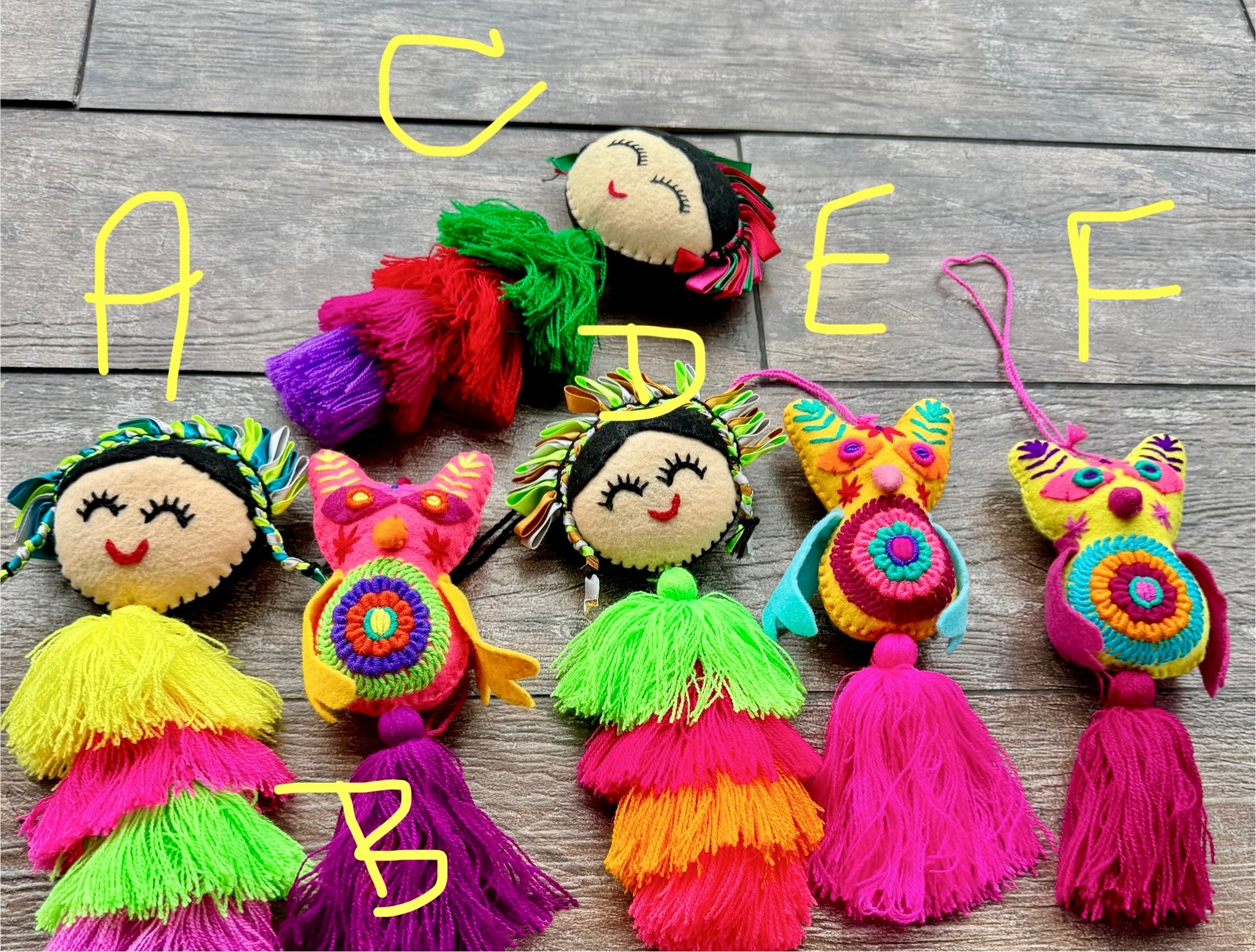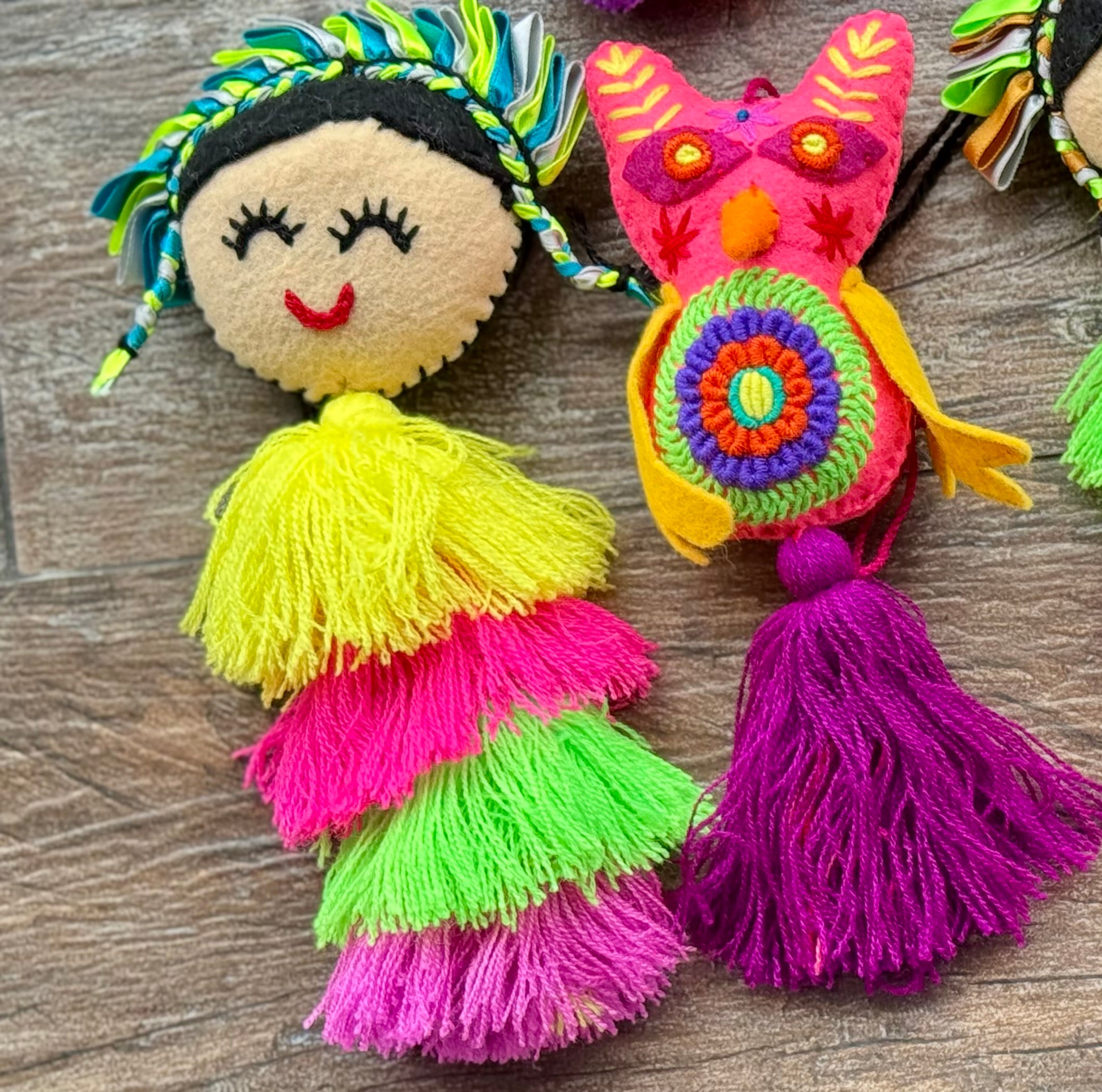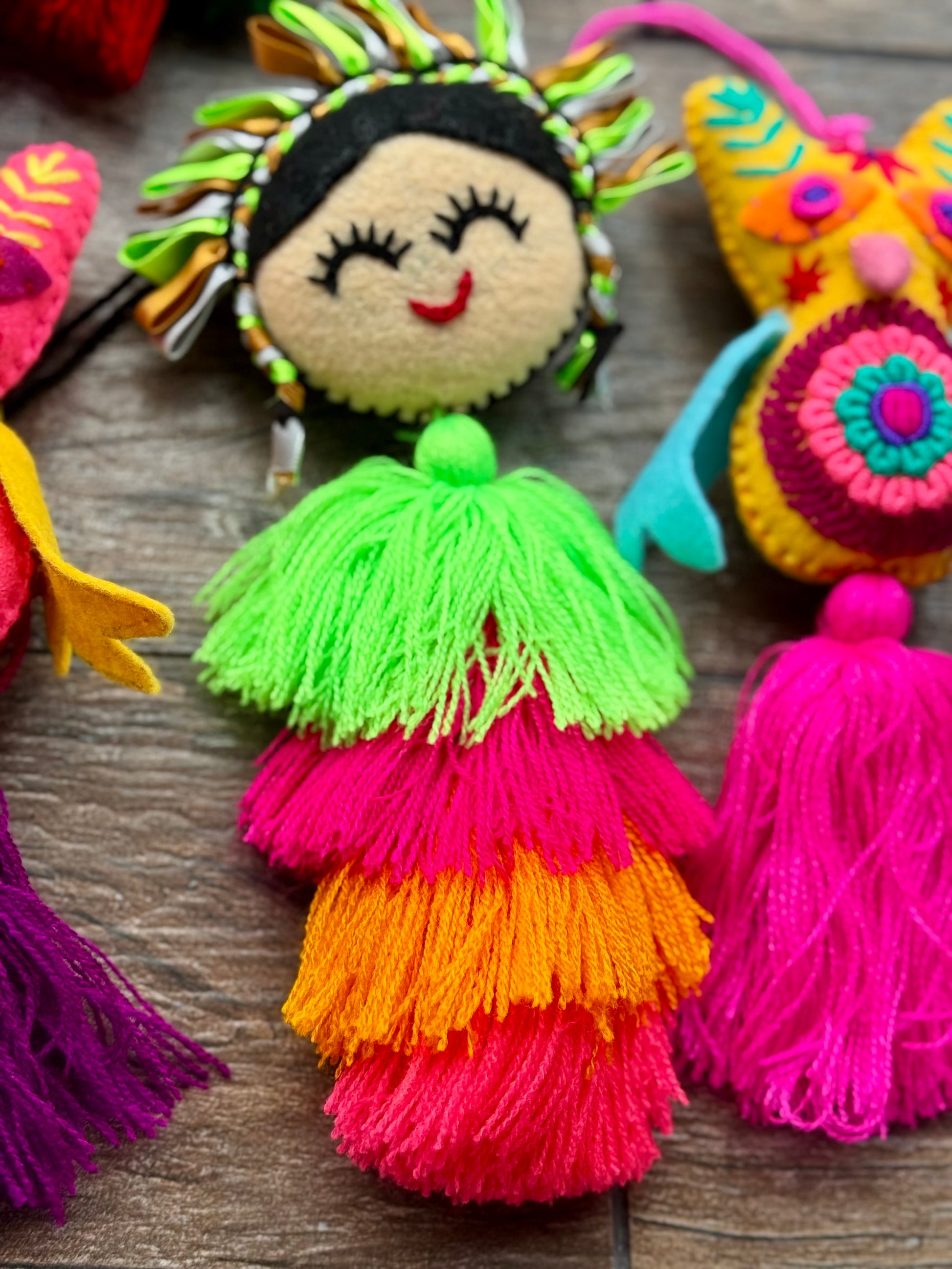 These beautifully handcrafted Mexican embroidery felt tassels are made with love in Chiapas, Mexico. Each tassel is meticulously embroidered by local artisans, capturing the vibrant colors and traditions of Mexican craftsmanship.💖These vibrant, handmade Mexican embroidery felt tassels are perfect for adding a pop of color and personality to your everyday accessories. Use them to decorate your purse, bag, or keychain for unique mexican culture touch. Hang them on your door or wall as a unique piece of home decor, or add a playful flair to your car's rearview mirror. Whether you're styling your personal items or brightening up your space, these versatile tassels bring a touch of Mexican craftsmanship wherever they go!💖