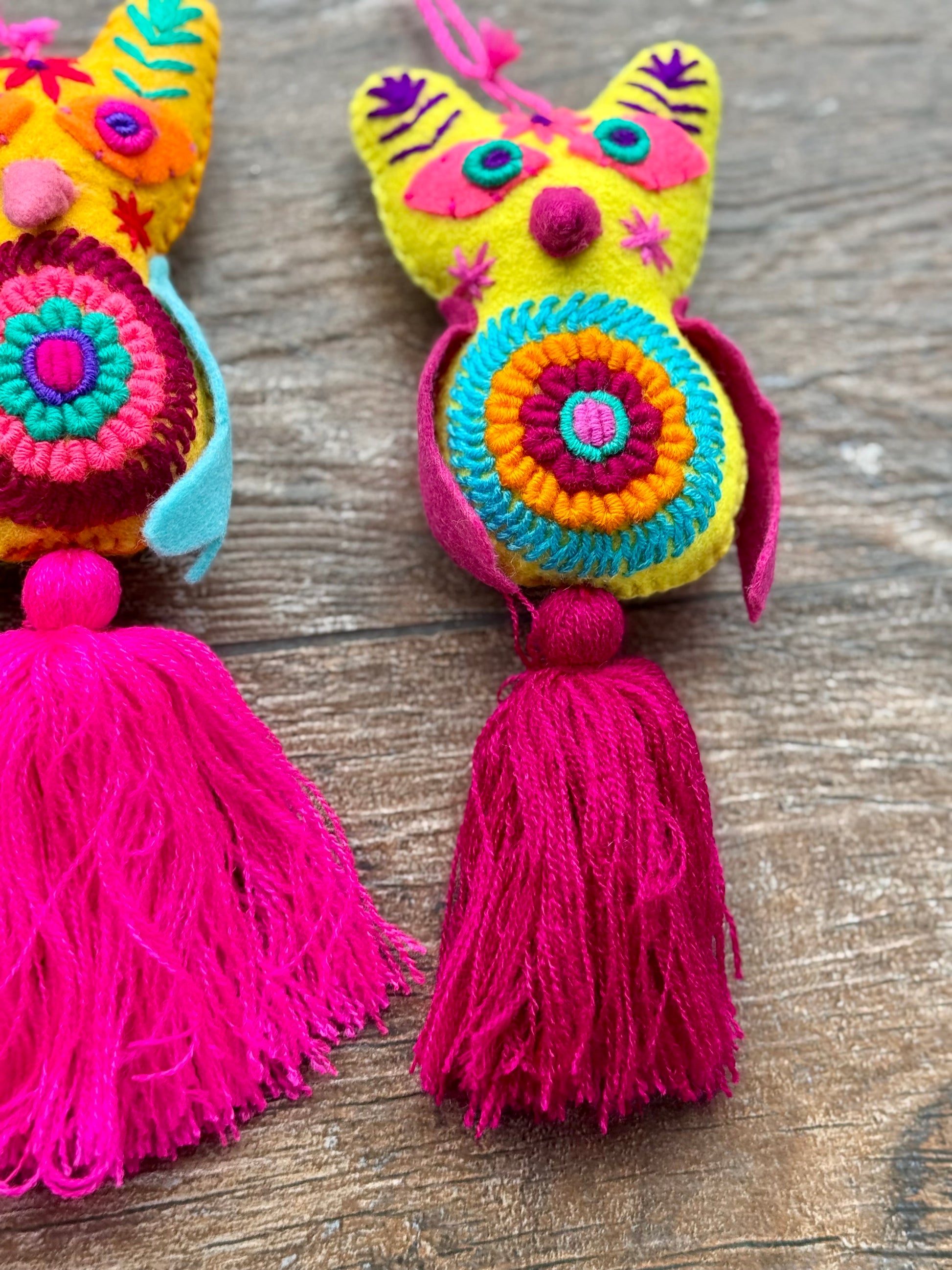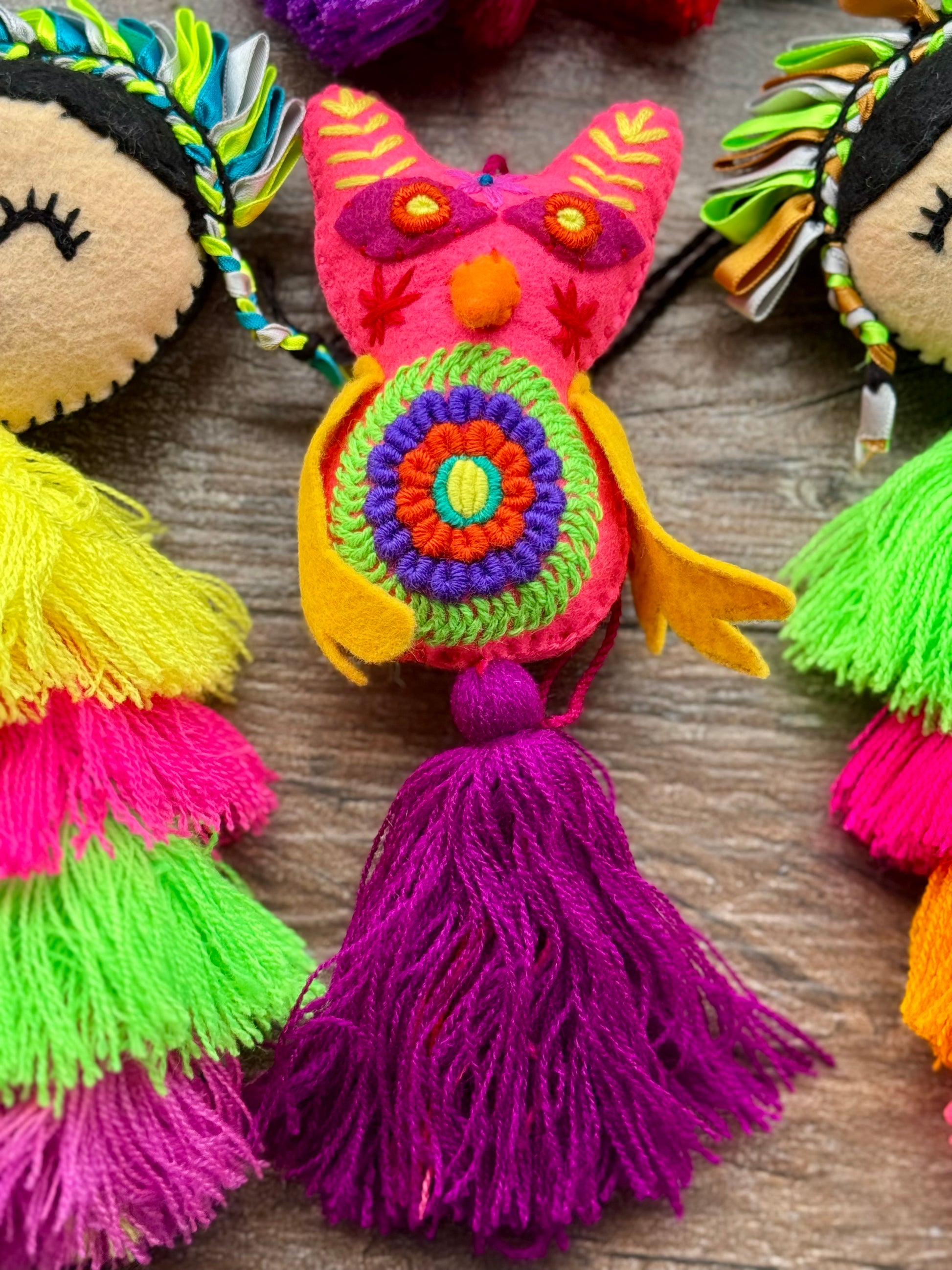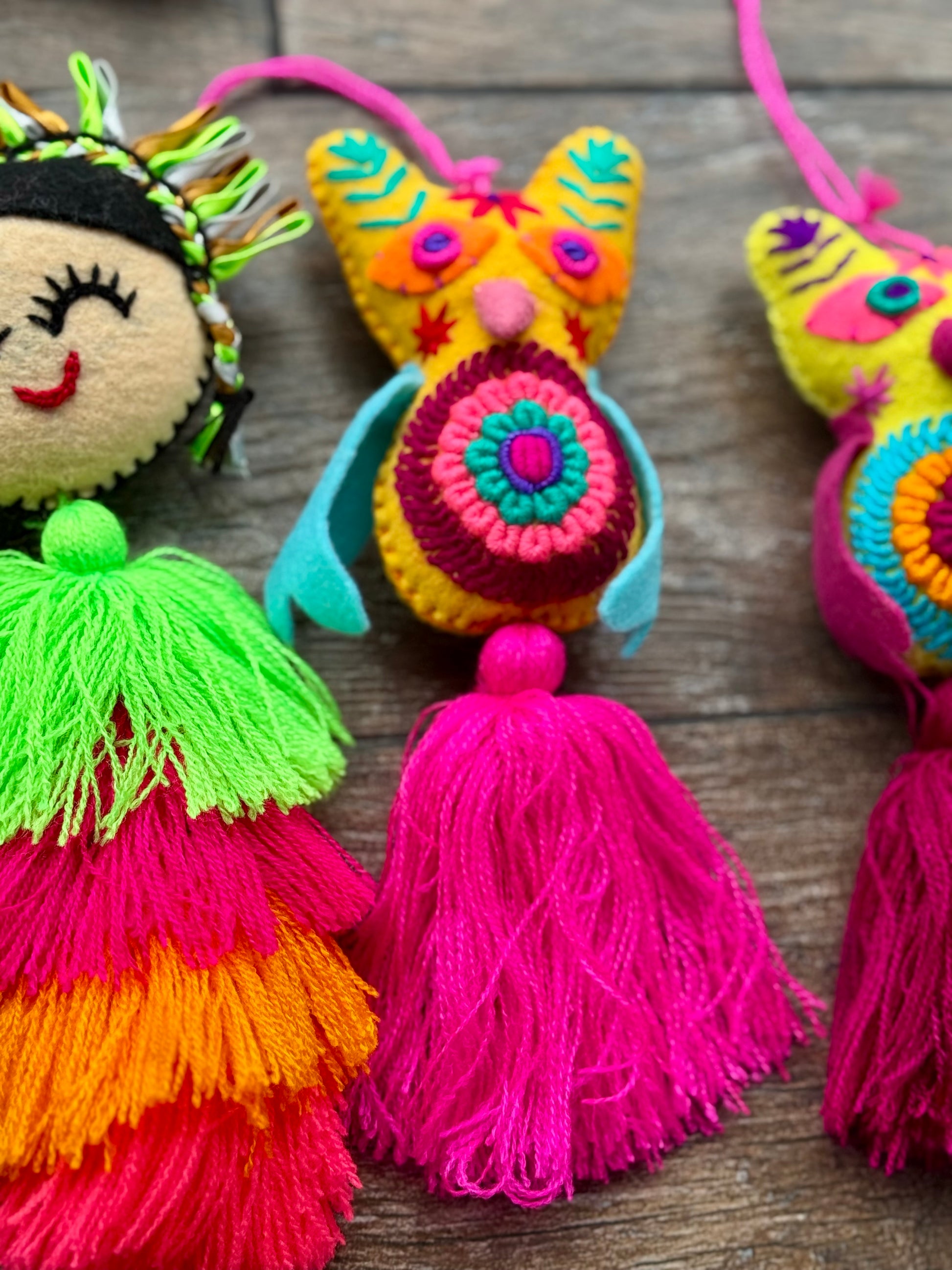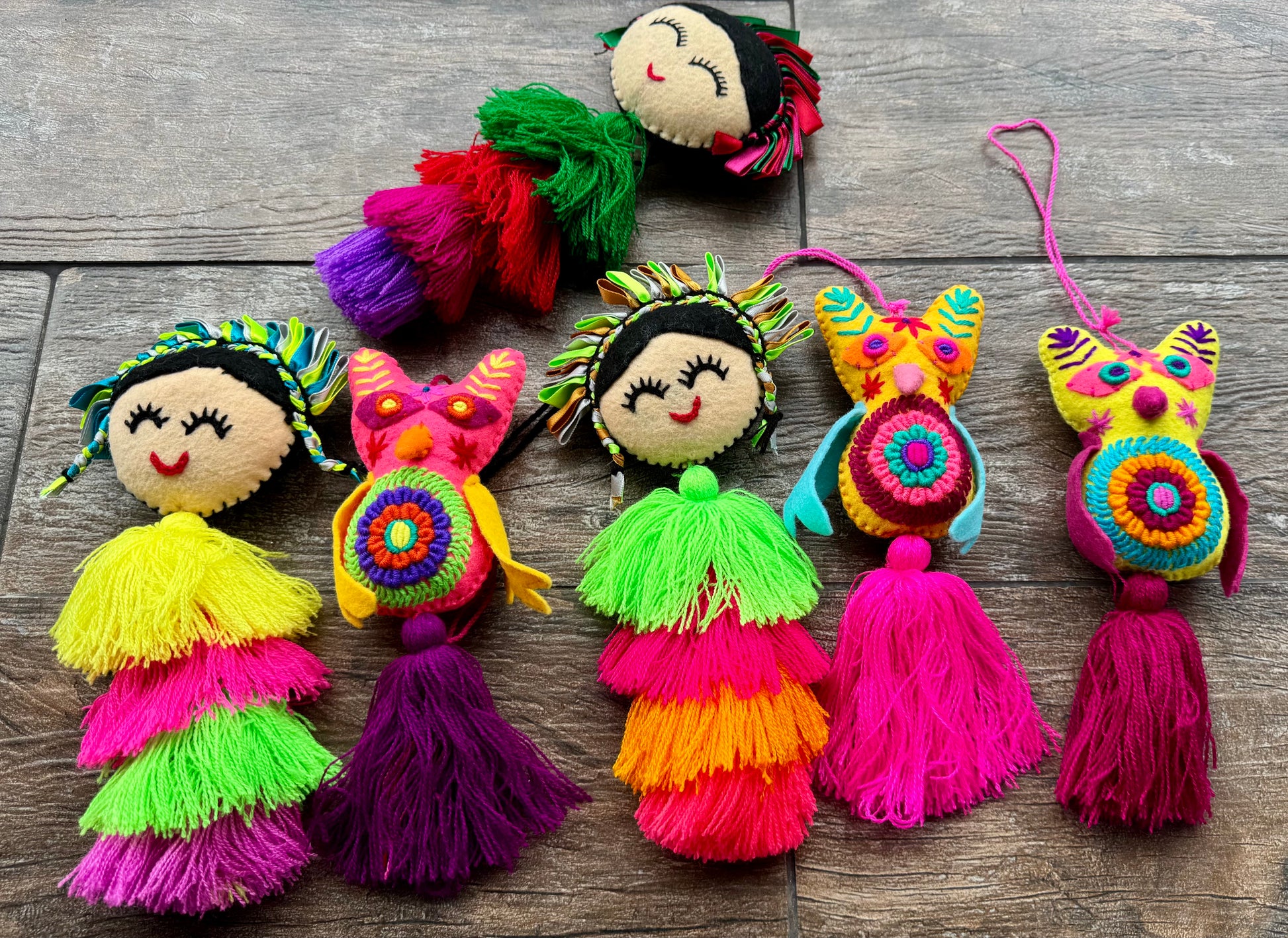 These beautifully handcrafted Mexican embroidery felt tassels are made with love in Chiapas, Mexico. Each tassel is meticulously embroidered by local artisans, capturing the vibrant colors and traditions of Mexican craftsmanship.💖These vibrant, handmade Mexican embroidery felt tassels are perfect for adding a pop of color and personality to your everyday accessories. Use them to decorate your purse, bag, or keychain for unique mexican culture touch. Hang them on your door or wall as a unique piece of home decor, or add a playful flair to your car's rearview mirror. Whether you're styling your personal items or brightening up your space, these versatile tassels bring a touch of Mexican craftsmanship wherever they go!💖