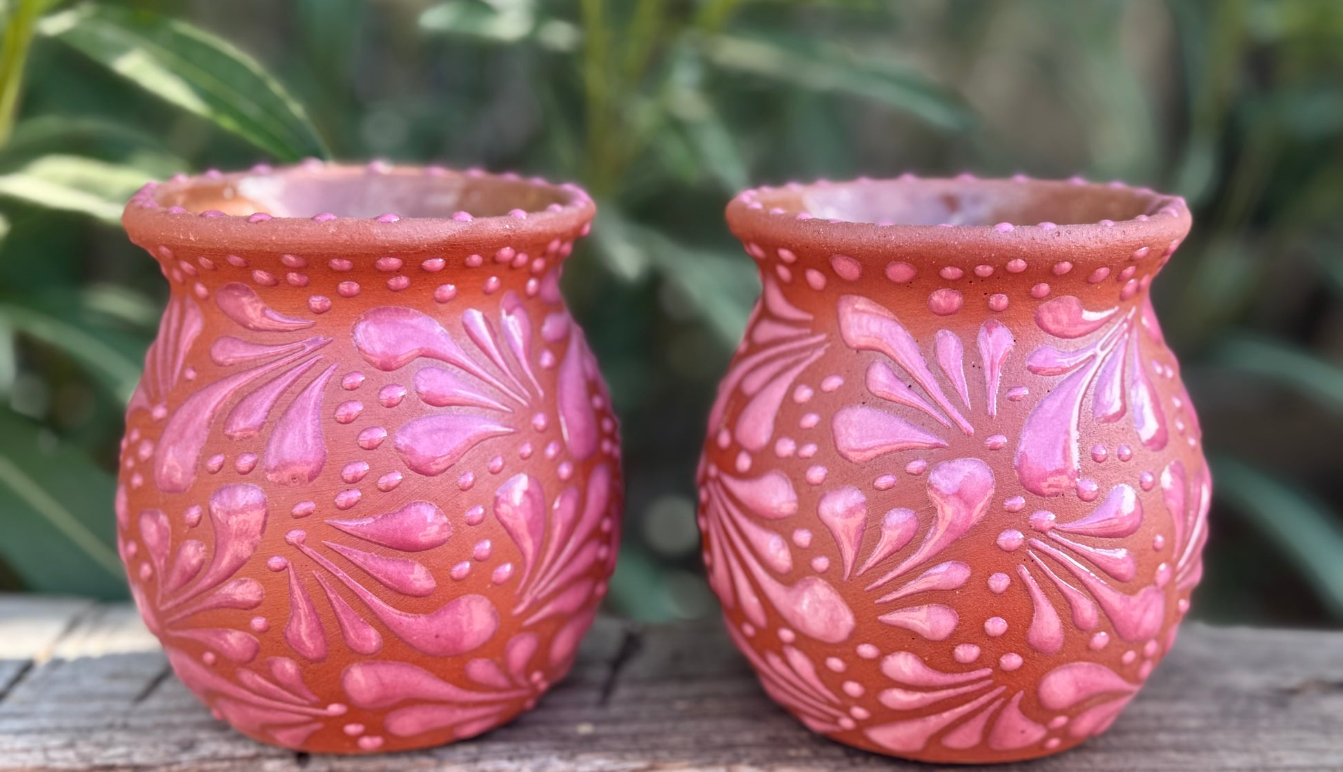 Set of Barro Talavera Style Mugs /Terracotta Base color with pink strokes